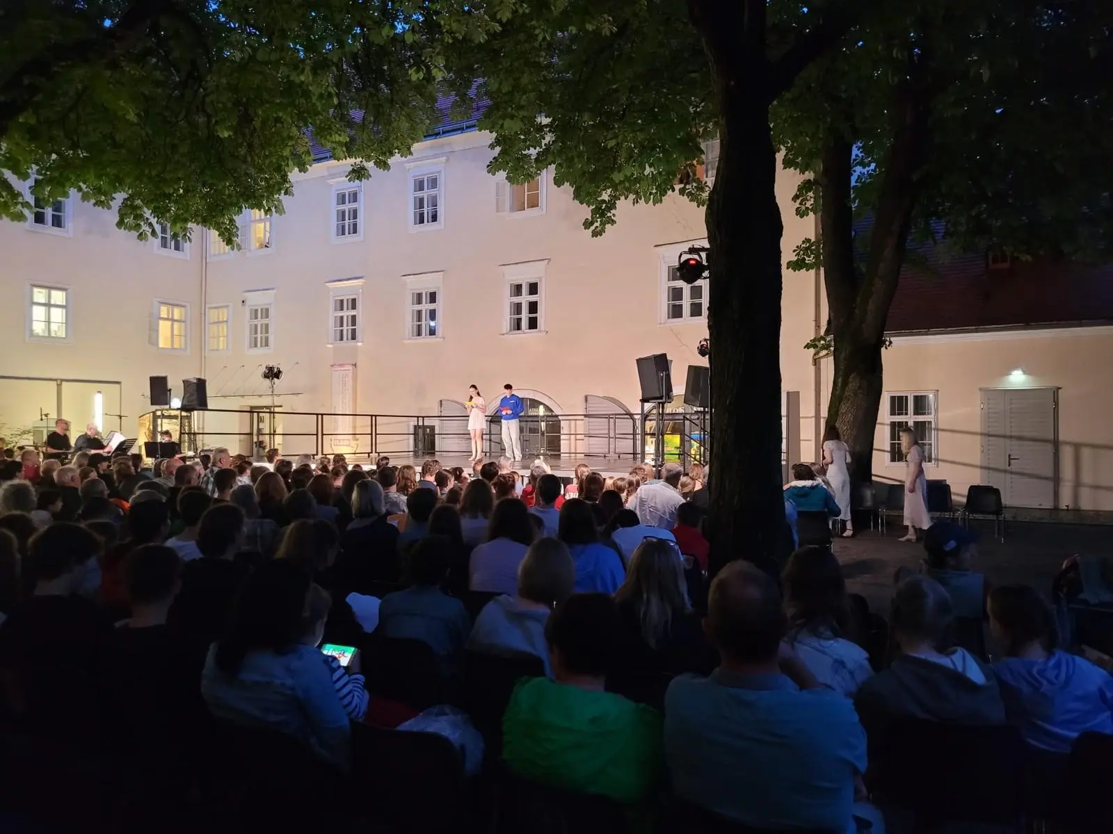 Wolkersdorf: Auch am Ende dieses Schuljahres, am Fr 7.06.2024 um 19.00 Uhr, präsentierte die große Gruppe der Teilnehmenden der Musicalakademie Wolkersdorf in einer grandiosen Abschlussshow ihr Talent. Die Generalprobe am Nachmittag musste noch aufgrund des Regens abgebrochen werden, aber am Abend war es wieder trocken und die beeindruckenden Darbietungen konnten auf der Bühne im Hof des Schlosses Wolkersdorf dem zahlreich erschienenen Publikum vorgeführt werden. Begeistert von der großartigen Darbietung der Jugendlichen zeigten sich nicht nur die Gäste, sondern auch das engagierte Referierenden-Team - Petra Niedermayer (Schauspiel), Tanja Petrasek (Gesang), Stefan Ulreich (Tanz) und Alexander Blach-Marius (Korrepetition). Die mitreißende Show der Musicaldarstellerinnen und Musicaldarsteller konnte sich sehen lassen und wurde mit tosendem Applaus belohnt.