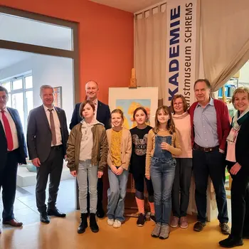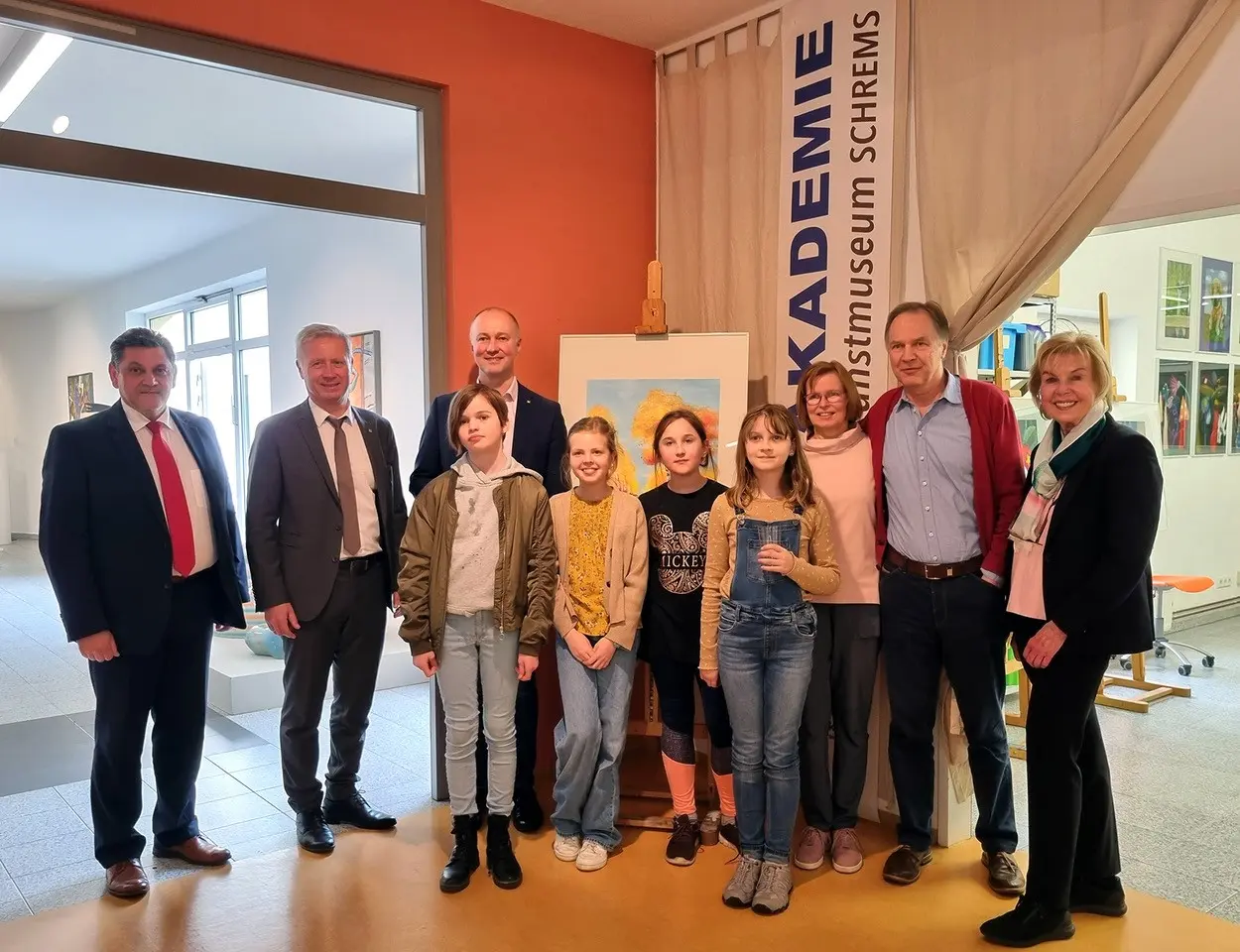 Von links: Bürgermeister Peter Müller (Schrems), Raika Direktor Dietmar Stütz, Mira Wanek, Rafael Ecker, Emma Zizka, Theresa Hochstöger, Iris Einfalt, Karin und Bernhard Antoni, Heide Warlamis