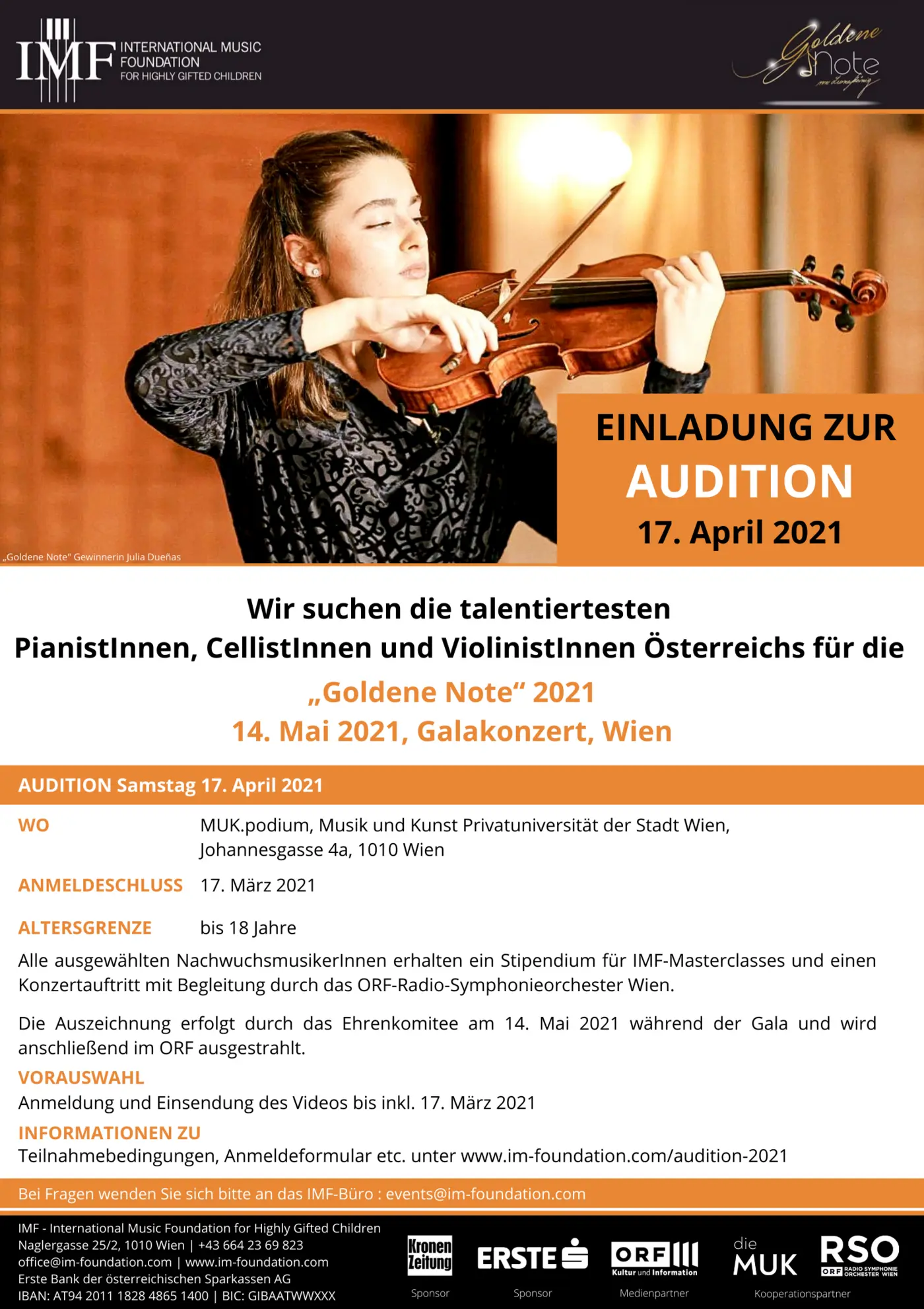 IMF lädt zur Audition für die „Goldene Note 2021" ein! AUDITION 2021, für Violine, Klavier und Cello – Soloinstrumente