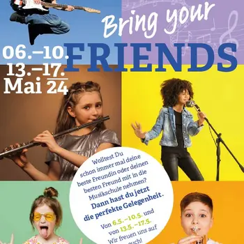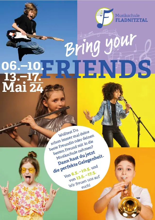 Die "Bring your friends-Woche" in der Musikschule Fladnitztal findet von Mo 6. Mai bis Fr 10. Mai sowie von Mo 13. Mai bis Fr 17. Mai 2024 statt! In diesen beiden Wochen haben unsere Schülerinnen und Schüler die fantastische Gelegenheit, ihre Freunde zu unseren Unterrichtsstunden mitzubringen und gemeinsam die Welt der Musik zu entdecken. Es erwartet sie eine Woche voller Spaß, Musik und neuen Erfahrungen. Wir laden alle herzlich ein, dabei zu sein und die Freude an der Musik zu teilen! Seid dabei und bringt eure Freunde mit – es wird eine unvergessliche Woche voller Musik und Spaß!