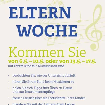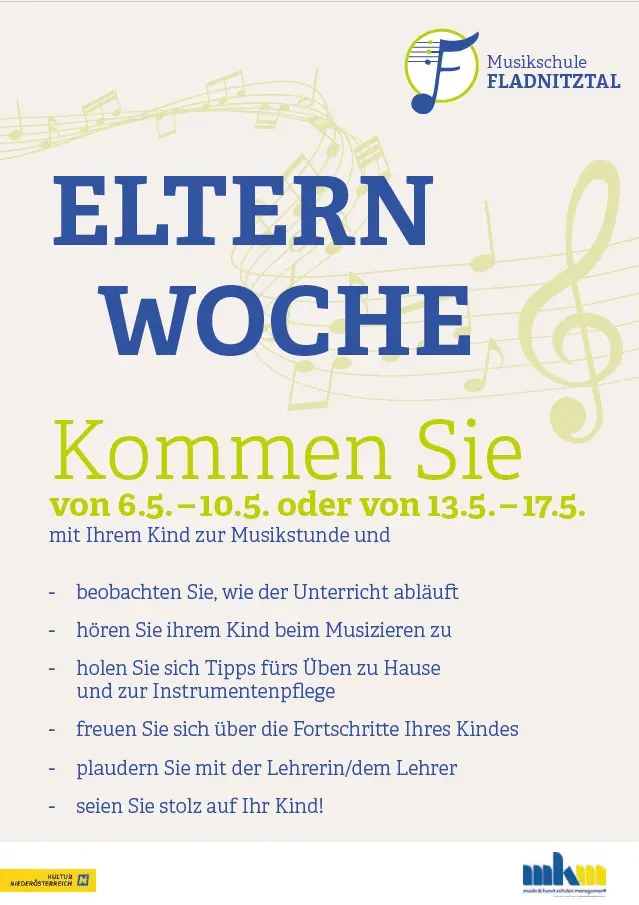 Die "Woche der Eltern" in der Musikschule Fladnitztal findet von Mo 6. Mai bis Fr 10. Mai sowie von Mo 13. Mai bis Fr 17. Mai statt! In diesen beiden Wochen sind alle Eltern herzlich eingeladen, an den Unterrichtsstunden ihrer Kinder teilzunehmen und einen Einblick in ihren musikalischen Fortschritt zu erhalten. Nutzen Sie diese Gelegenheit, um Ihre Kinder beim Musizieren zu unterstützen und die gemeinsame Leidenschaft für Musik zu teilen. Wir freuen uns darauf, Sie in unserer Musikschule begrüßen zu dürfen!