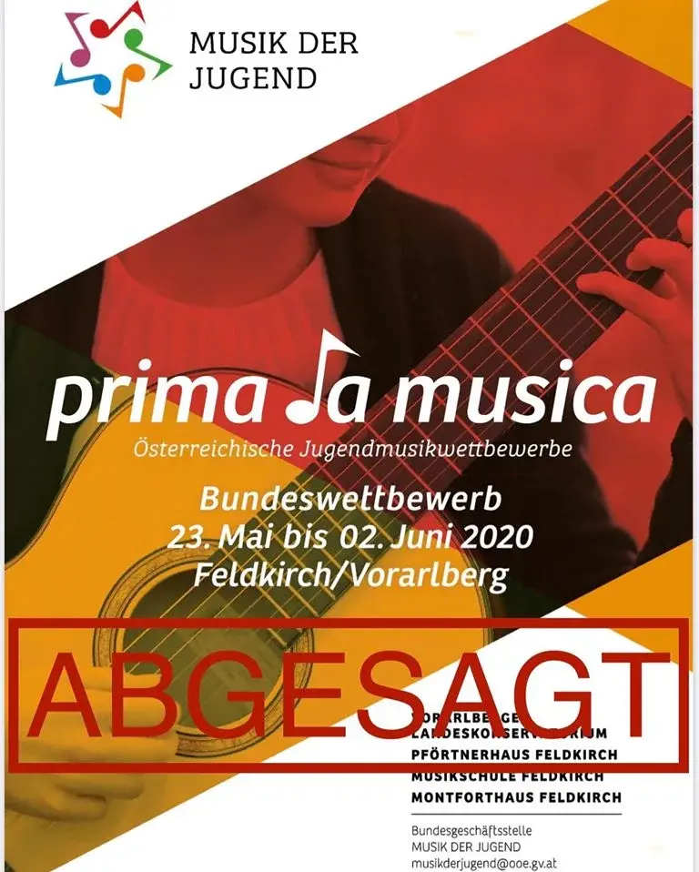 Der Bundeswettbewerb prima la musica 2020 kann aufgrund der außerordentlichen COVID-19-Pandemie nicht von 23. Mai bis 2. Juni 2020 in Feldkirch/Vorarlberg stattfinden. Sobald weitere Entscheidungen getroffen wurden, informieren wir umgehend. Abgesagt ist somit auch das NÖ Bundespreisträgerkonzert am 23. Juni 2020.
