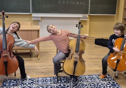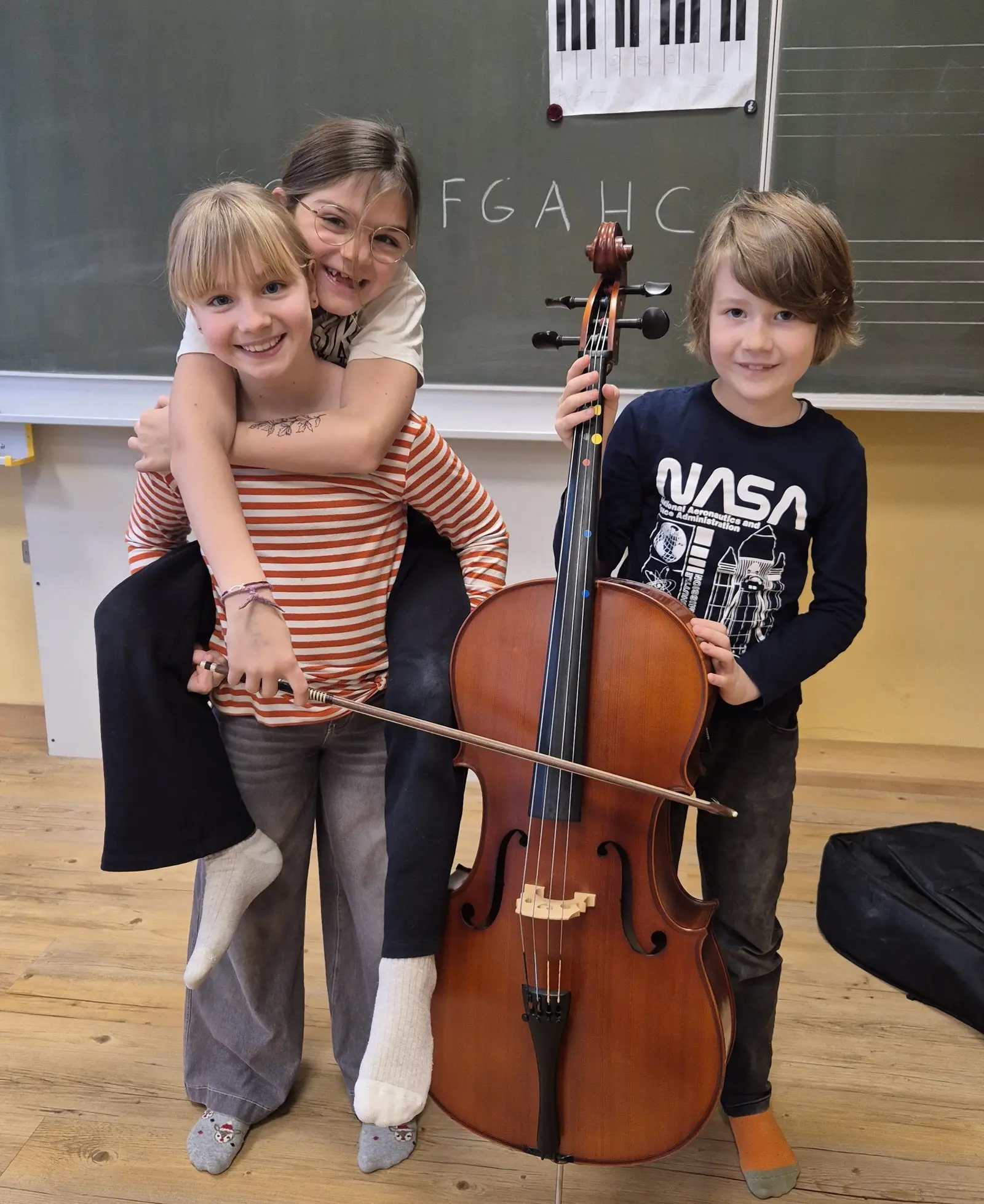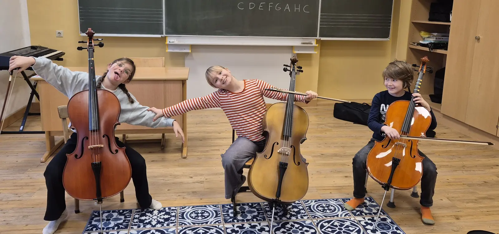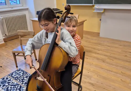 Emil, Ines und Rosa hatten viel Spaß in der Musikschule der Korneuburger Musikfreunde. Es ging um Impressionen des Stückes König der Löwen und, was besonders hohen Unterhaltungswert hatte, das waren die Cellospiel-Kunststücke. Dabei war auch körperlicher Einsatz gefragt. Man kann es auf den Fotos sehen. Die Lehrkraft Maike Clemens hatte den Nagel damit auf den Kopf getroffen. Die Kids gaben ihr Bestes!