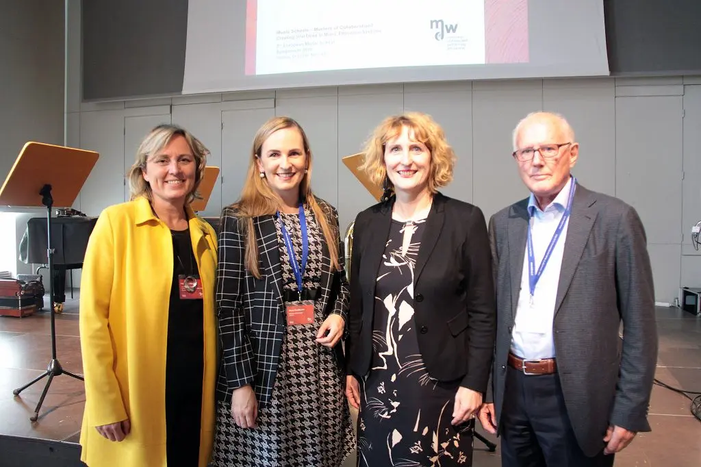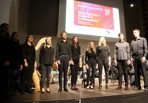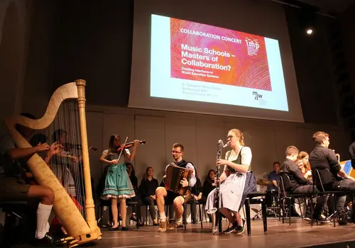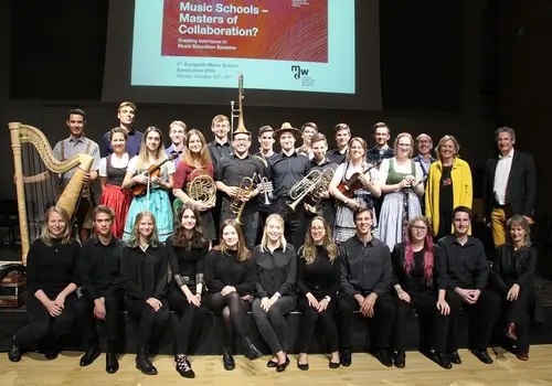 Mit einem gemeinsam konzipierten Konzert umrahmten 26 Musikschülerinnen und -schüler aus allen Bundesländern das hochkarätig besetzte Symposium mit 140 Expertinnen und Experten aus 25 europäischen Ländern an der Universität für Musik und darstellende Kunst Wien.