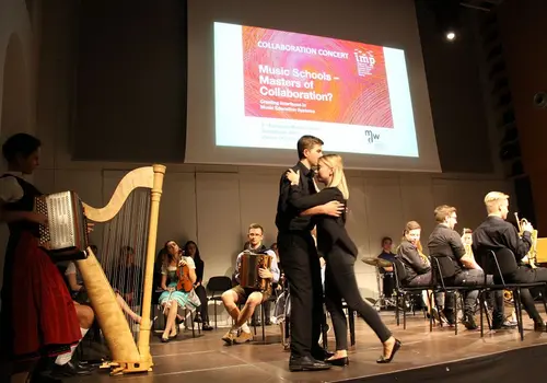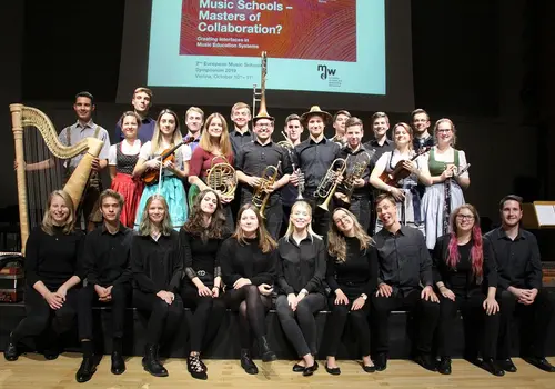 Mit dem Konzert „Collaboration“ konnten die österreichischen Musikschulen gemeinsam ein Vorzeigeprojekt organisieren: 26 junge Musikschülerinnen und Musikschüler aus allen Teilen Österreichs umrahmten mit verschiedensten Stücken aus ihren Heimatländern das zweite europäische Musikschulsymposium, das am 10. und 11. Oktober 2019 an der Universität für Musik und darstellende Kunst Wien stattfand.