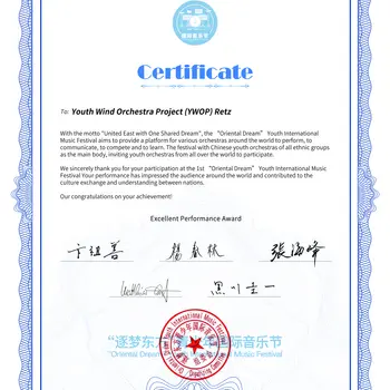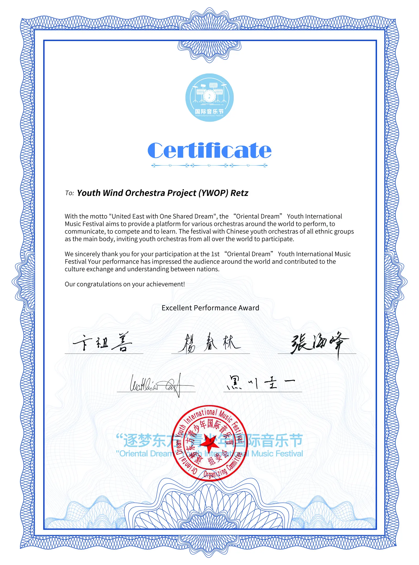 Das Komitee dankte dem Youth Wind Orchestra Project (YWOP) Retz für die Teilnahme am 1. Internationalen Jugendmusikfestival „Oriental Dream“, das im April 2023 online über die Bühne ging. Um daran teilzunehmen, musste man einen Konzertmittschnitt und eine fundierte Orchesterbeschreibung über Projekte und Wettbewerbserfolge einreichen. Der Auftritt des Orchesters, so steht es auf dem Zertifikat, beeindruckte das Publikum auf der ganzen Welt und trug zum Kulturaustausch und der Verständigung zwischen den Nationen bei. Das Komitee gratulierte zu der Performance beim Auftritt im Auditorium in Grafenegg und zum „Excellent Performance Award“.