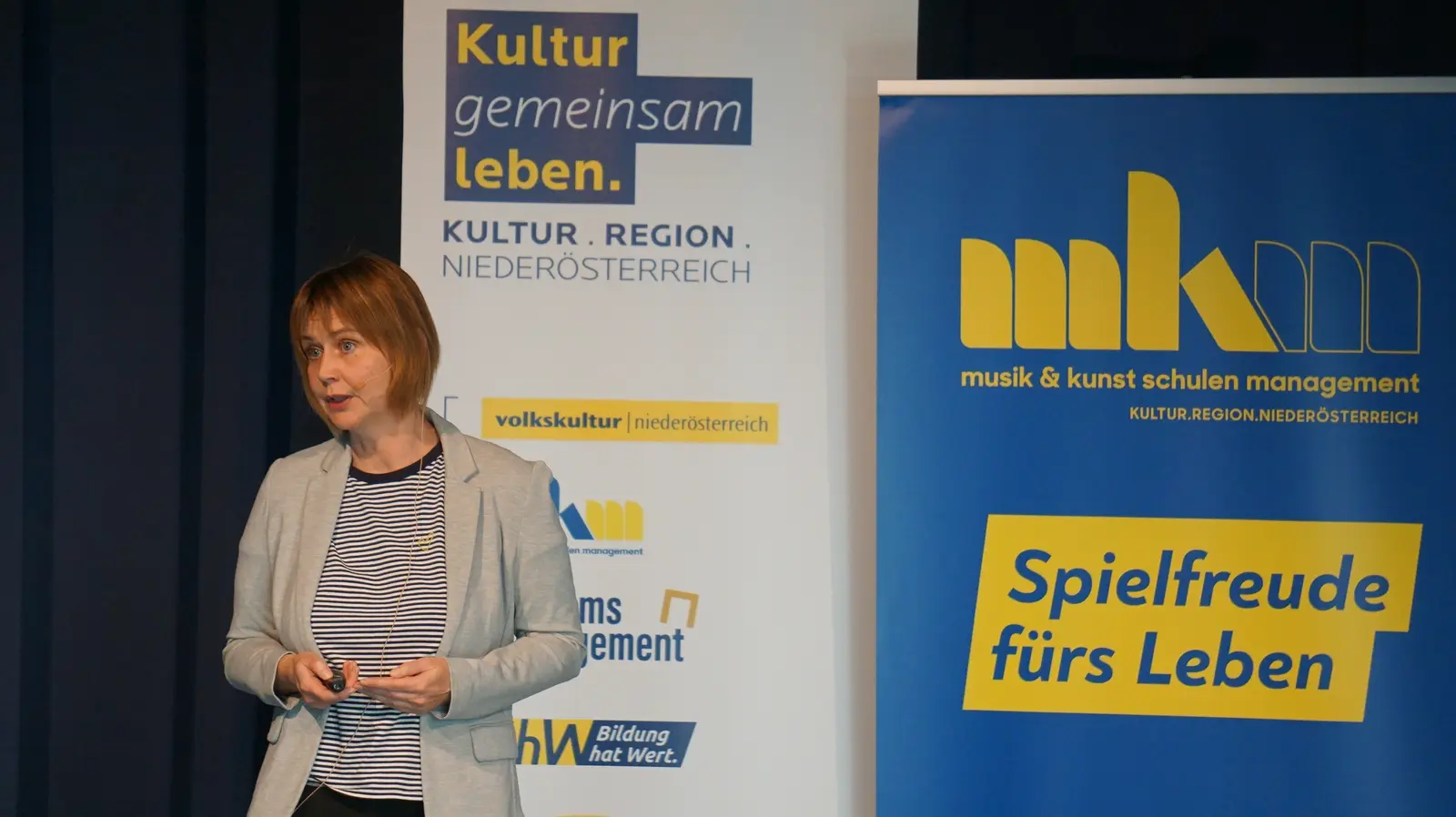 Dr. Michaela Hahn, die Geschäftsführerin des Musik & Kunst Schulen Management Niederösterreich, freute sich besonders, dass nach vier Jahren wieder eine Gesamtleiter:innentagung in Präsenz mit 126 hochengagierten und motivierten Musikschulleiterinnen und -leiter stattfinden konnte. In diesem Zusammenhang wies sie auf die Relevanz der persönlichen Begegnungen und des direkten Austausches untereinander hin.