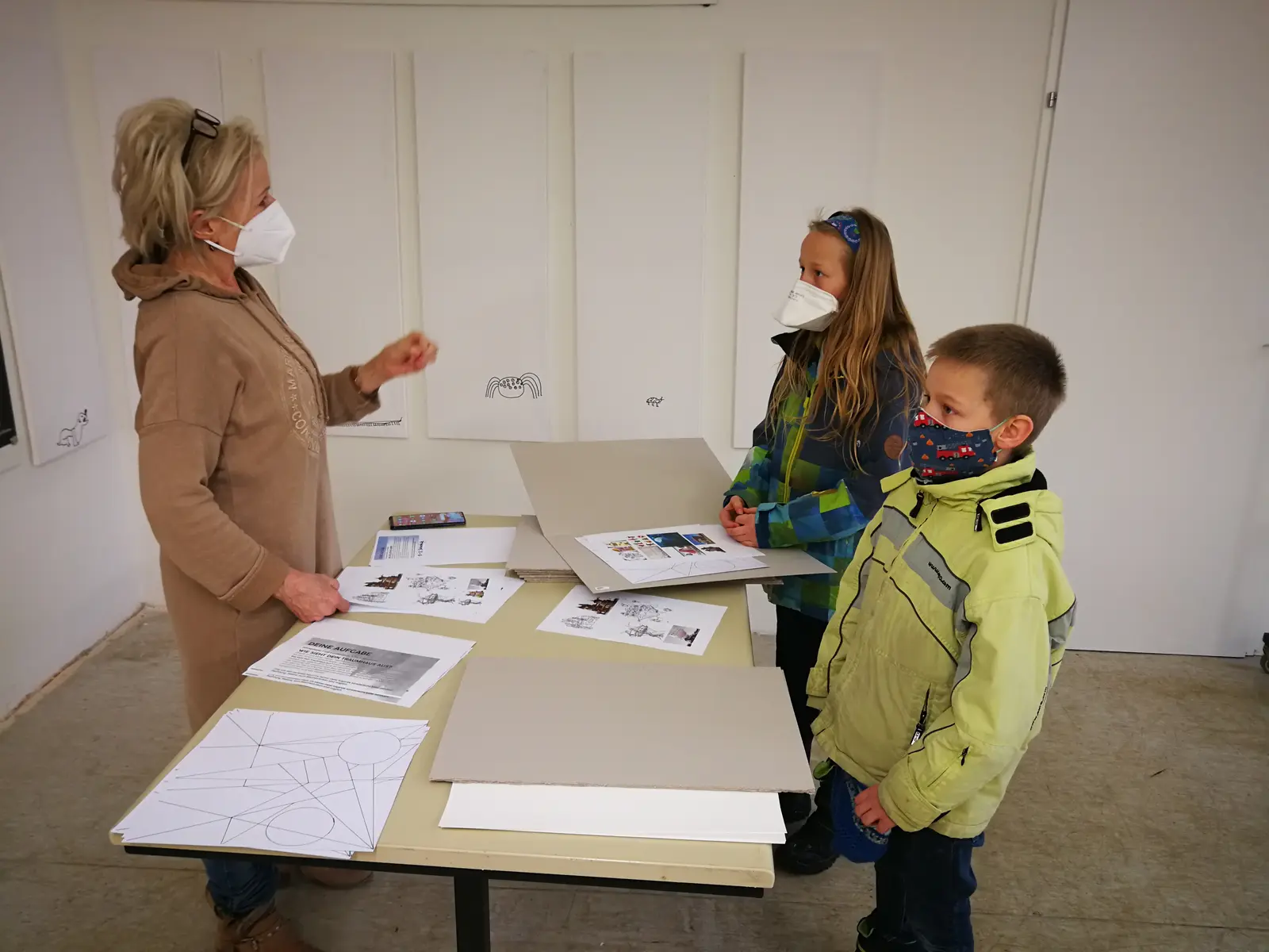 Diese bringen sie dann wieder in der nächsten Woche vorbei. Die Arbeiten werden anschließend, unter Einhaltung aller Hygienemaßnahmen, kurz besprochen. Anschließend werden die jungen Künstlerinnen und Künstler wieder mit neuem Material versorgt. Die Kinder kommen einzeln bzw. Geschwister zu zweit. Dies fällt nicht in das Stundenkontingent der Kreativakademie, sondern bieten die Referierenden als eine "Tankstelle" zum "Ideenauftanken" an.