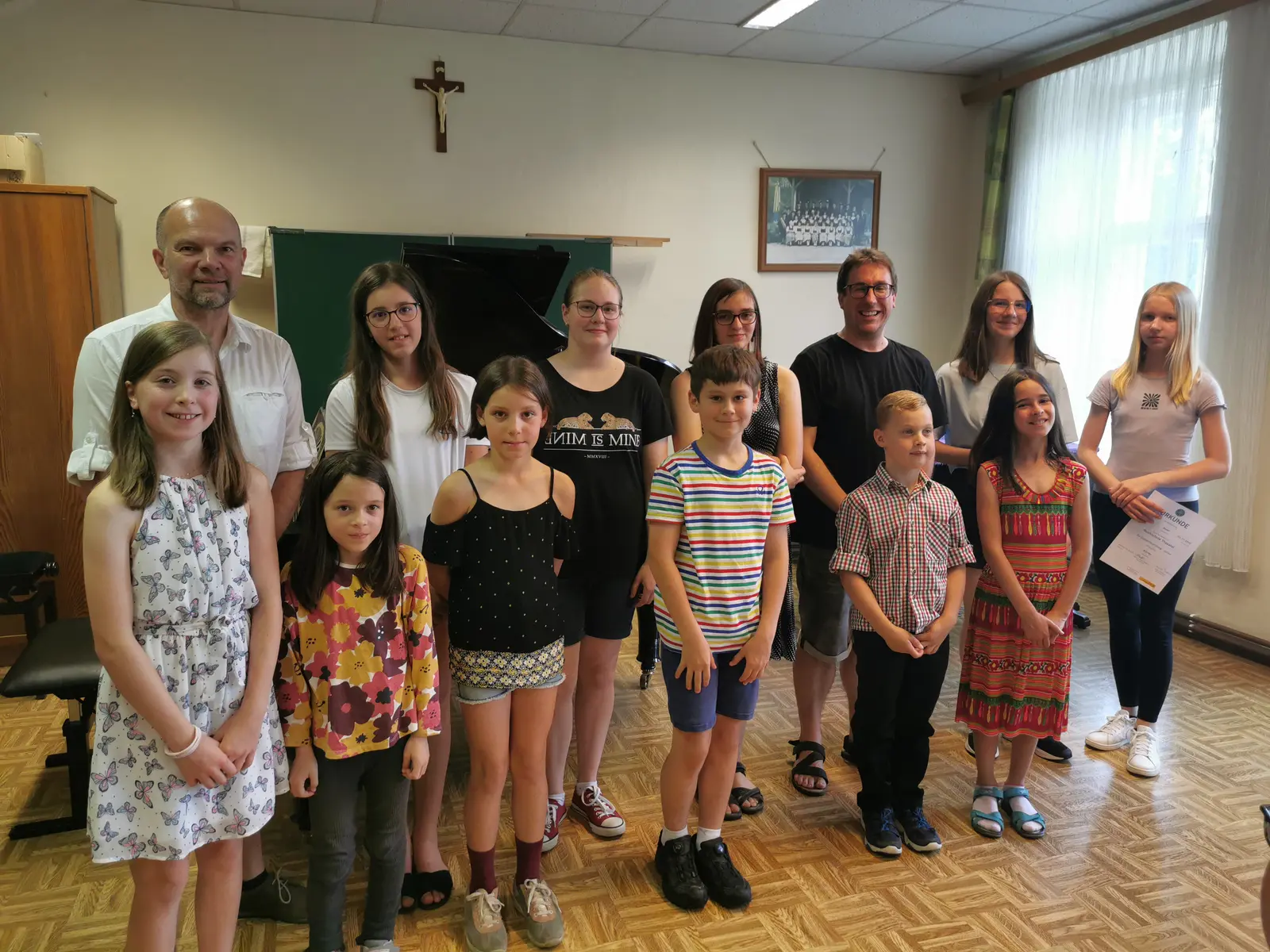 In bewährter Manier war die Klavierklasse der Musikschule Thayatal unter der Leitung von Christoph Eberhardt am Do 22. Juni 2023 in zwei aufeinanderfolgenden Konzerten in Oberndorf/Raabs zu hören. Um 18.00 Uhr eröffnete Isabella Merzdovnik mit “Wolken”. Es folgten ein “Walzer für die linke Hand”, gespielt von Daniel Heger und Reinhard Diogo-Lehner mit “Heinzelmännchen”. Julia Pleßl begeisterte die Zuhörerinnen und Zuhörer mit dem italienischen Volkslied “Bella Bimba”. Zum “Dreiklangsdance” lud Markus Harrer. Wunderbar interpretierte Sophia Gönner das Lied “Drachensteigen”. Nach Florian Piffls “Nächtlicher Reise” wurde es wieder tänzerisch mit einem “Boogie” und “Rock it”, gespielt von Emilia Heger. Den Schluss machte Jan Stefal mit “Die Moldau”. Um 19.00 Uhr musizierten Karoline Dimmel und Julian Bind Klassiker wie “An die Freude”, oder einen “Wanzentanz”. Sehr geschickt erwies sich Johanna Scheimer beim erneuten “Walzer für die linke Hand”. “In Eile” meisterte Luisa Forster ihren Auftritt, gefolgt vom “Reiterstück” von Alexander Reiß. An Beethoven versuchte sich Nora Forster. Mit “Land of Hope and Glory” beeindruckte Johanna Bauer. Musikalität und Können zeigte Anna Bayer mit Bartoks “Studie für die linke Hand”. Nach dem Popsong “Faded”, stimmungsvoll interpretiert von Laura Merzdovnik, beeindruckte Marlene Gererstorfer mit Schuberts Scherzo Nr.1. Einen Höhepunkt zum Abschluss bot der 1. Satz von Beethovens Sonate op.10/1, vorgetragen von Andrea Nothmüller. Unter der Aufsicht von Musikschulleiter Michael Treadaway absolvierten innerhalb dieses Konzerts Markus Harrer, Johanna Bauer und Anna Bayer ihre Juniorprüfungen mit Auszeichnung.