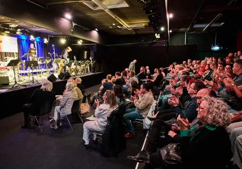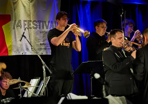 Am Sa 24. Mai 2025 brachte das Jugendjazzorchester Niederösterreich die Tischlerei Melk zum Beben: Das Ensemble spielte unter der Leitung von Dirigent Andreas Pranzl Big Band-Sound vom Feinsten. Auf dem musikalischen Programm standen am ersten Teil des Abends fünf Uraufführungen des Komponisten Jakob Kammerer. Die Werke des Künstlers beschäftigen sich mit der Entstehung und Veränderung zwischenmenschlicher Begegnungen, womit das Motto „Begegnungszone“ des diesjährigen Most/4 Festivals perfekt umgesetzt wurde.