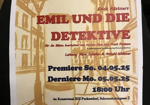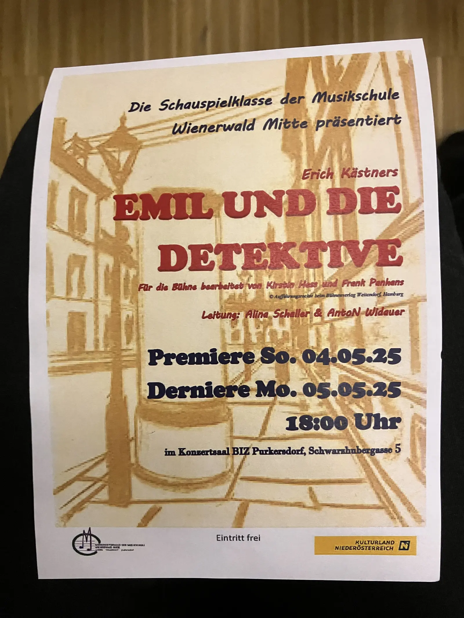 Am Mo 05. Mai 2025 fand in Purkersdorf in der Musikschule Wienerwald Mitte die umjubelte Aufführung der Schauspielklasse von “Emil und die Detektive” statt. Die Schauspielklasse, die erst in diesem Schuljahr entstanden ist, steht unter der Leitung von Alina Schaller und Anton Widauer.