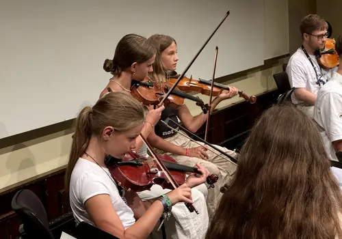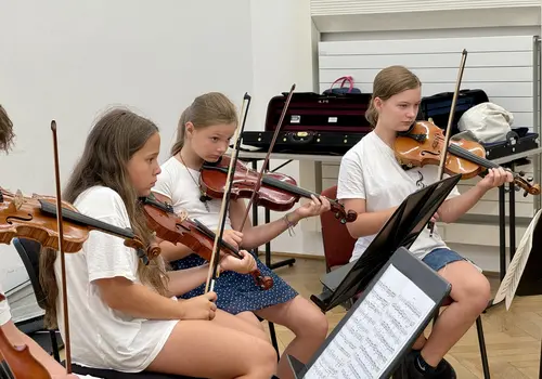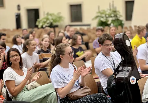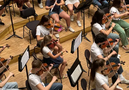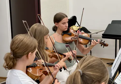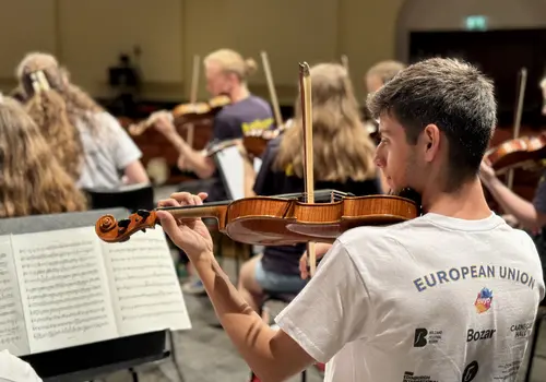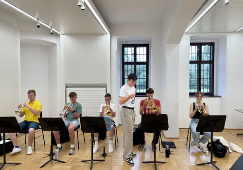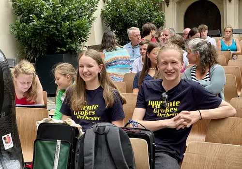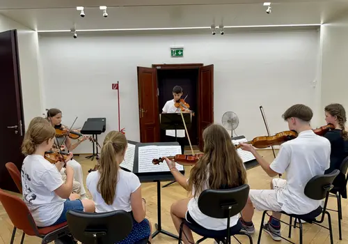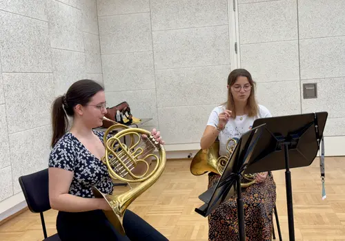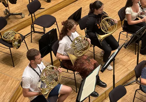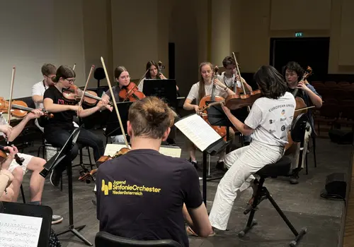 Ein besonderes Highlight war das „Close Up“-Angebot. Hier konnten sich unerfahrene Orchestermusikerinnen und -musiker mitten ins Orchester setzen und das einzigartige Klangerlebnis hautnah miterleben. Für die Fortgeschrittenen gab es Stimmproben, bei denen in kleineren Gruppen gemeinsam mit Mitgliedern des EUYO gearbeitet wurde. Dieser Workshop bot eine ideale Plattform für den musikalischen Austausch auf Augenhöhe, ganz ohne den Druck eines Konzerts.