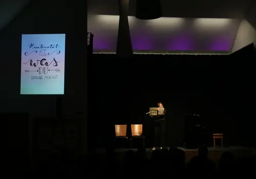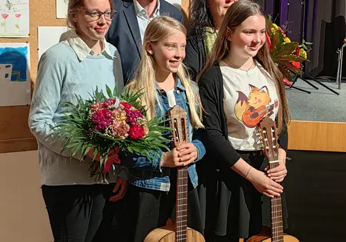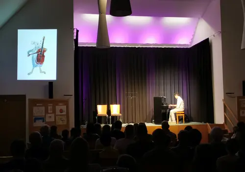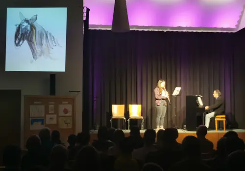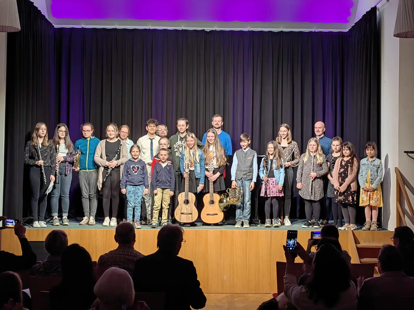 Die Werke der jungen Künstler:innen konnten in einer großflächigen multimedialen Bilderschau bestaunt werden und verbanden sich auf diese Weise mit den Darbietungen der Musikschüler:innen im anschließenden Konzert. Die Bedeutung und Wichtigkeit des bildnerischen und musischen Schaffens in unserer heutigen Gesellschaft konnte an diesem Abend so einem begeisterten Publikum vermittelt werden.