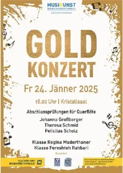 Musikschülerinnen der Musik- und Kunstschule Waidhofen/Ybbstal treten zu ihrer Abschlussprüfung in Gold an. Die Goldprüfung im Fach Querflöte findet am Freitag 24. Jänner um 18 Uhr im Kristallsaal, Schloss Rothschild statt. Johanna Großberger und Felicitas Scholz aus der Klasse von Regina Maderthaner und Theresa Schmid aus der Klasse von Fereshteh Rahbari stellen vor einer fachkundigen Jury und dem Konzertpublikum ihre musikalischen Fähigkeiten an der Querflöte unter Beweis. Die Musik- und Kunstschule Waidhofen/Ybbstal ist sehr stolz darauf, dass es die Jugendlichen durch viel Fleiß und Ausdauer bis zur Goldprüfung geschafft haben. Musikschuldirektor Christian Blahous freut sich besonders auf das bevorstehende Konzert der jungen Musikerinnen und wünscht ihnen alles Gute für die Prüfung. Musikbegeisterte und Kulturinteressierte dürfen gerne bei diesem erfolgversprechenden Konzert dabei sein!
