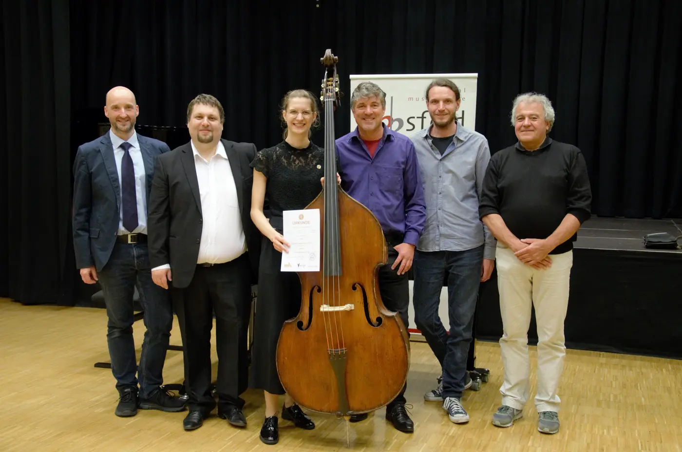 1: v.r.n.l.: Musikschulleiter Johann Grabner, Korrepetitor Jozsef Kollar, Schülerin Pia Dietl (Kontrabass - Gold mit ausgezeichnetem Erfolg), Klassenlehrer Johann Kaar, Prüfer Josef Wagner, Prüfer Anton Schachenhofer