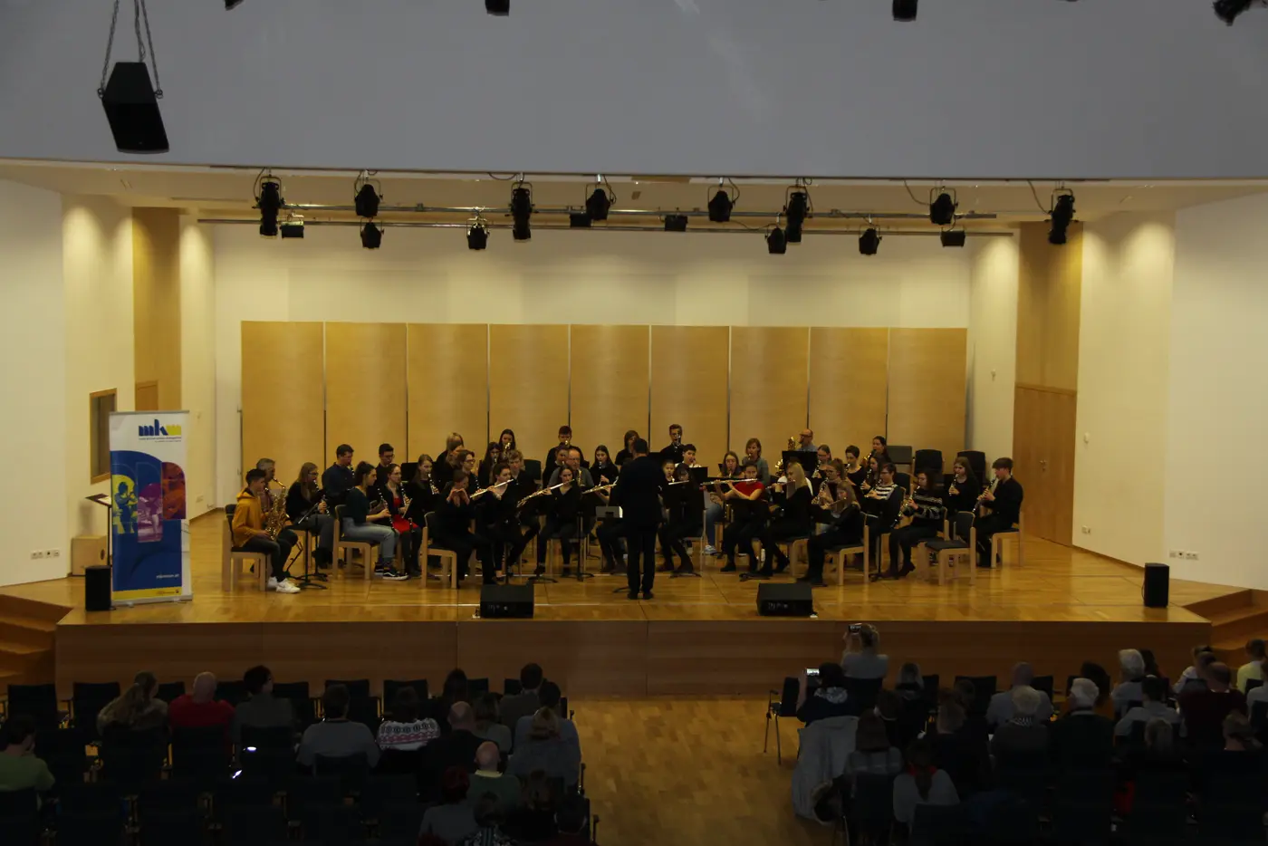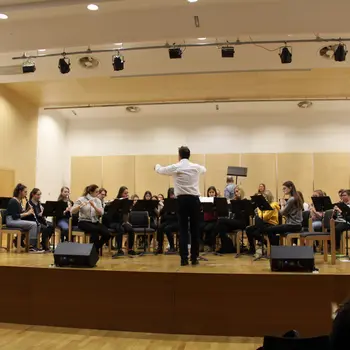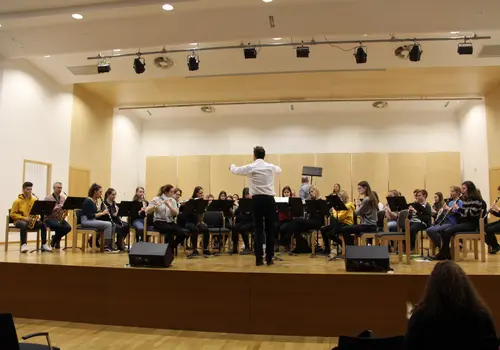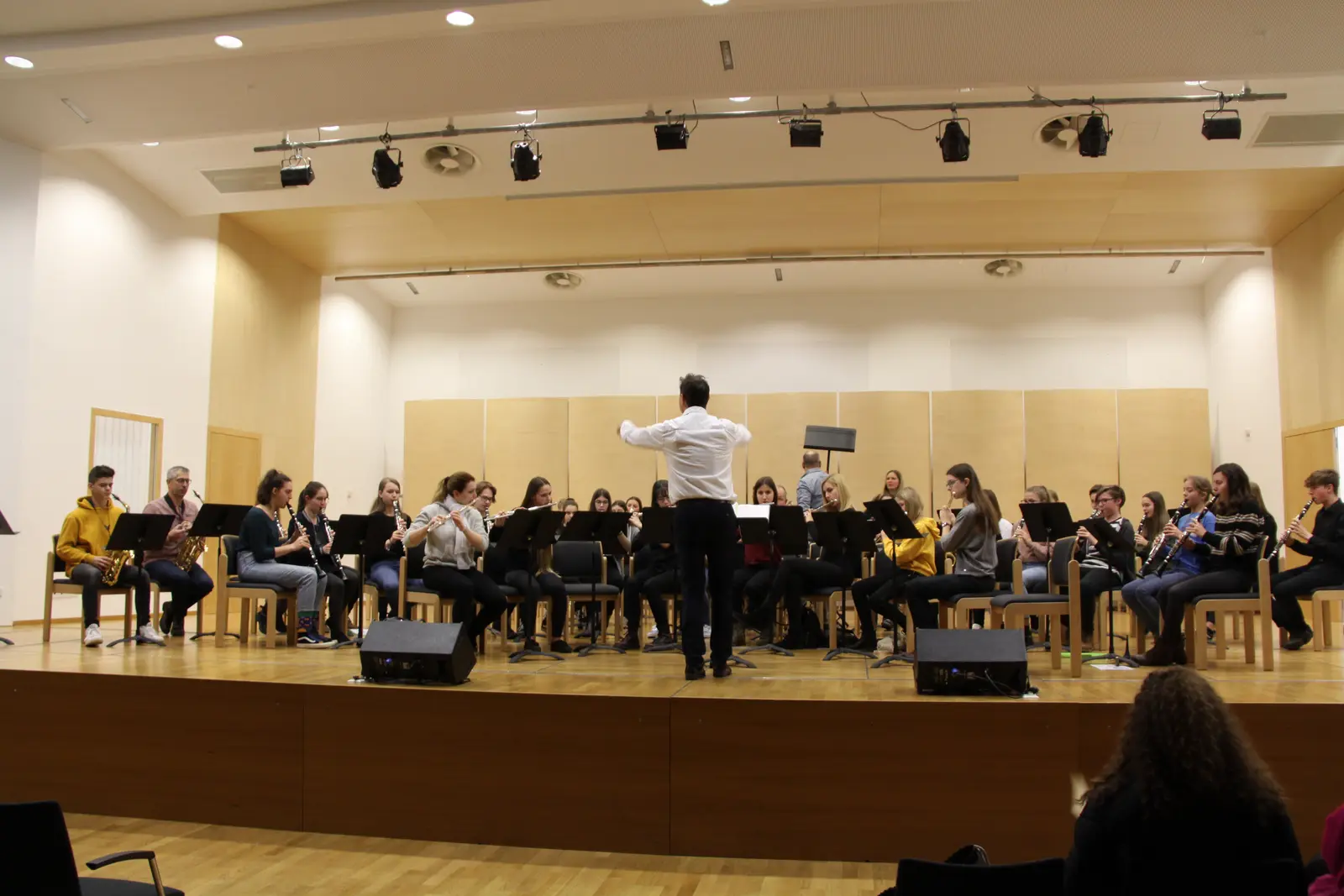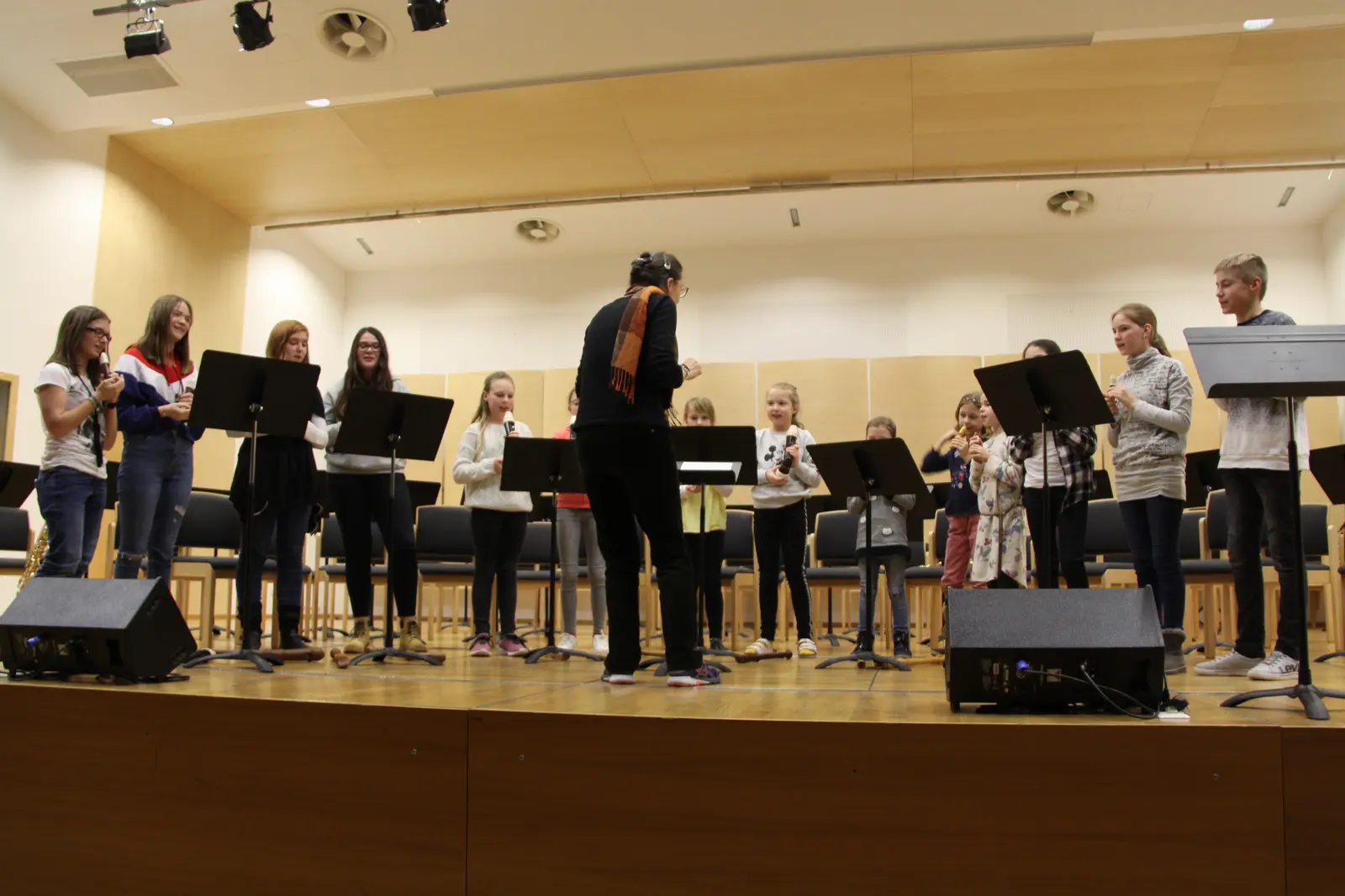Die 80 jungen Musikerinnen und Musiker bekamen den ganzen Tag wertvolle Inputs von Dozenten: Ensemblecoaching (Carsten Eckert | Blockflöte, Rupert Fankhauser | Klarinette, Lev Pupis | Saxophon, Walter Wretschitsch | Querflöte), Auftrittstraining und Bühnenpräsenz (Nikolaus Selimov) und gemeinsames Orchesterspiel (Markus Holzer) stand am Programm des Tages.