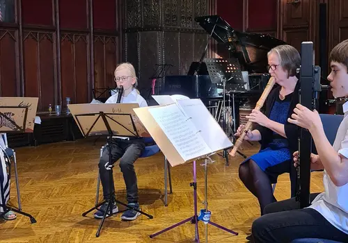 Musikschuldirektor Peter Vasicek – der übrigens auch aktiv mitwirken „durfte“ - erzählte, dass die Abteilungsleiterin Petra Renner ursprünglich die Idee gehabt hatte, ein intensives Kammermusikprobenwochenende in einem netten Rahmen zu verbringen und danach das Gelernte dem Publikum zu präsentieren. So war es auch heuer. Geprobt und geübt wurde in Bad Traunstein und dann durften es die Gäste in Korneuburg genießen. Weitere „Säulen“ dieses alljährlichen Projektes sind die Abteilungsleiterin Ulrike Kloss und der Trompetenlehrer Walter Fend. Lehrer, Schüler und Eltern ziehen an einem Strang und so kann sich das Ergebnis hören und sehen lassen. Die Eltern sind vorrangig gefragt, das Buffet zu unterstützen und so gab es auch heuer wieder gute Brötchen, Mehlspeisen und eine „Kammermusiktorte“.
