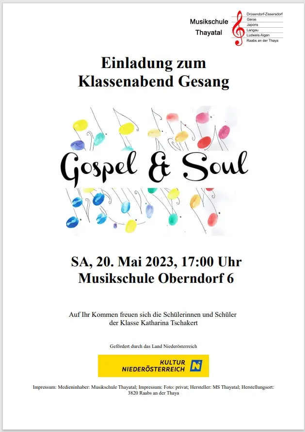 Die Musikschule Thayatal lädt herzlich zum Klassenabend der Gesangsklasse von Katharina Tschakert. Geboten wird Musik aus dem Bereich Gospel & Soul".