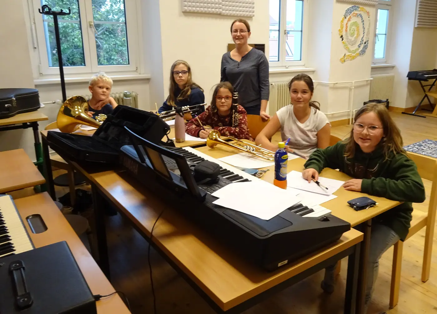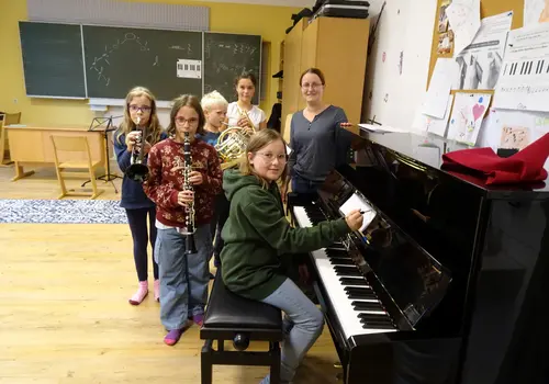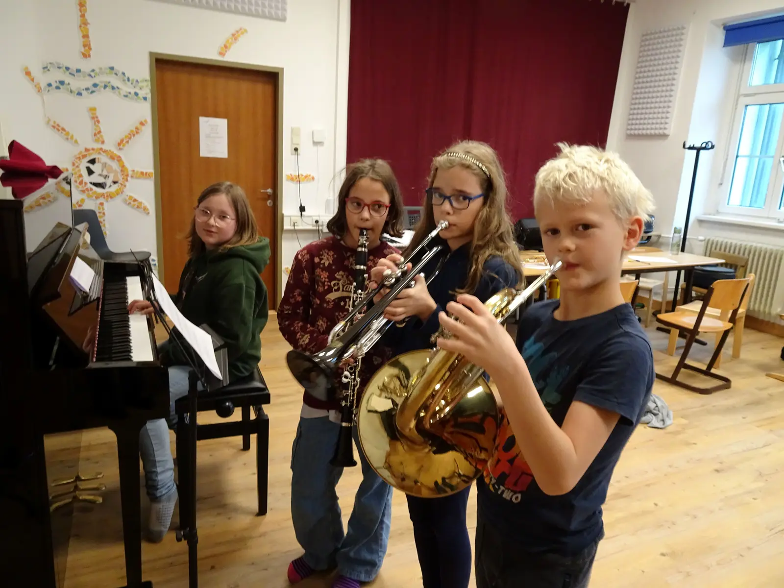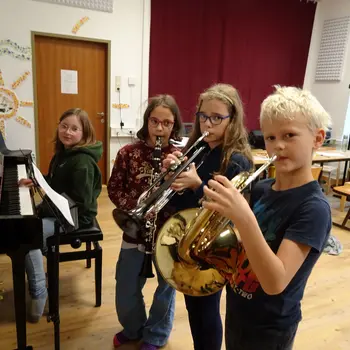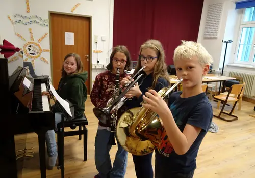 - Foto 3: Kilian, Leonie, Anna und Marie-Sophie versuchen, wie’s klingt, wenn sie ihre Kompositionen spielen