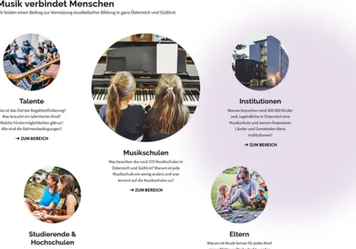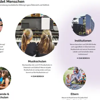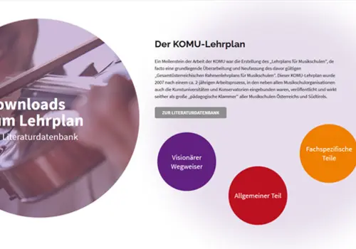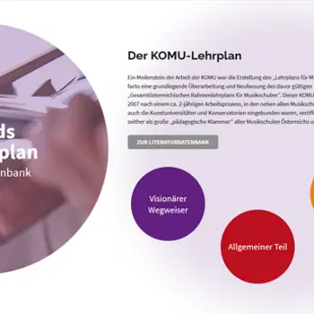 Mit dem neuen Design der Website www.komu.at wird das vielfältige und flächendeckende Angebot der musikalischen Bildung in den Musikschulen der Bundesländer übersichtlich und vor allem zeitgemäß nähergebracht. Bei der Konzeption der neuen Website war es ein besonderes Anliegen, die Angebote und Schwerpunkte des Musikschulwesens für alle Zielgruppen, vor allem Musikschulleiter:innen, Lehrenden, Hochschulen, Studierenden, Eltern und Institutionen sowie diversen Fachexpert:innen, verständlich und transparent aufzubereiten.