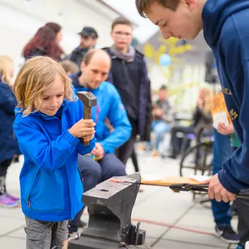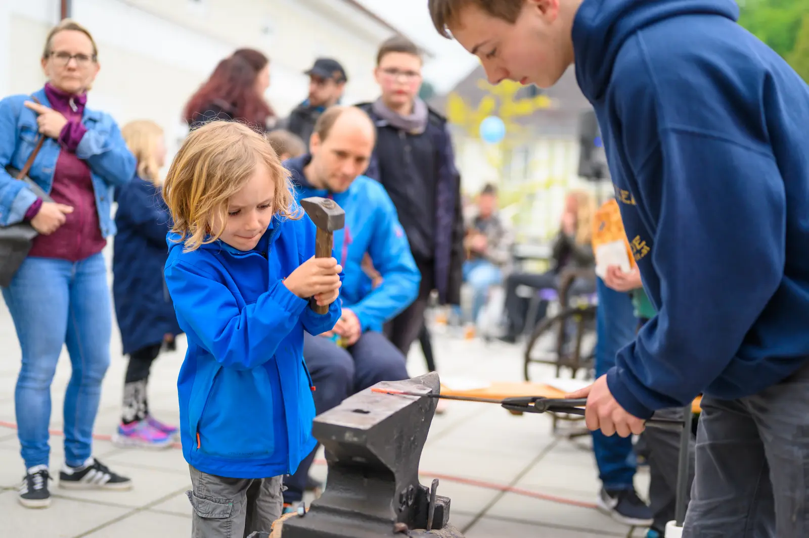 Foto5: Früh übt sich – Schmiedeteilnehmer Kajetan Pöchhacker zeigt den jungen Besuchern den Umgang mit dem Schmiedehammer