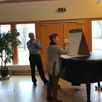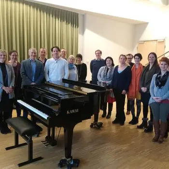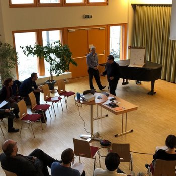Der Vormittag stand unter dem Motto "komponieren-kreieren-kommunizieren". Helmut Schmidinger, Komponist und Dozent an der Kunstuniversität Graz, brachte Praxisbeispiele für den Unterricht und erläuterte vielfältige Möglichkeiten, das Thema "Komponieren" im Unterricht einzubauen. Anhand einer "Spontankomposition" aller Anwesenden demonistrierte er einen kreativen Schaffensprozess, der mit allen Alters- und musikalischen Niveaugruppen in der Praxis umsetzbar ist.