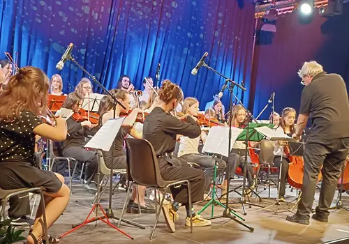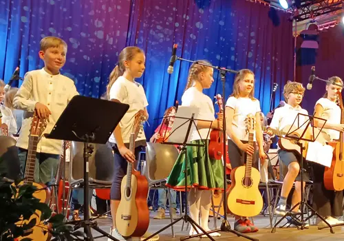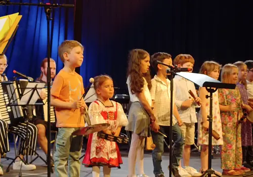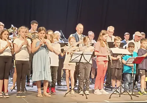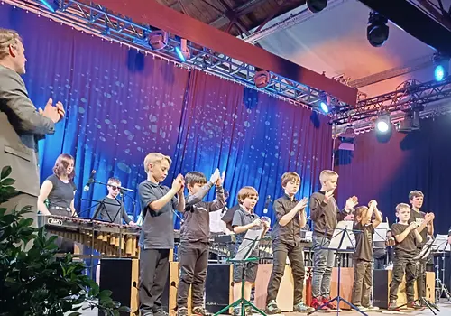 Die ersten Klänge hörte man bereits am Nachmittag, als die Generalprobe über die Bühne ging. Die Schüler:innen mussten sich mit der Akustik und den räumlichen Gegebenheiten in der Werfthalle vertraut machen. Dann ging’s um 17.00 Uhr so richtig los. Die Jüngsten aus der Musikalischen Früherziehung mit dem Stück Hab’ne Tante in Marokko ernteten riesigen Beifall, aber nicht nur sie, auch die weiteren Darbietungen wurden vom Publikum mit reichlich Beifall belohnt – sei es Big Band mit Sir Duke, der Kinderchor mit Waldlied, das Gitarrenensemble mit The Builder, das Ballett mit dem Ungarischen Tanz Nr.5, das Schlagwerk/Percussionensemble mit Freed vom Desire, das Vororchester mit Auf Uns, die Jazzband mit Cantina Band, die Flöten-Cello-Harfen-Gruppe mit El Choclo, das Blockflötenensemble mit Get it, das Jugendblasorchester mit Pirates oft he Caribbean, die Band Rockin‘ Rascals mit einem James Bond Medley, das Schulorchester mit Go West und auch die Stadtmusik, welche als Gast mitgewirkt hat. Sie spielte unter der Leitung von Peter Vasicek das Stück Born tob e wild gemeinsam mit den Nachwuchsmusiker:innen – nämlich mit den Schüler:innen des Jugendblasorchesters unter der Leitung von Roland Fesl und den Blockflötenschüler:innen von Petra Renner. Fast wurde die Bühne zu klein! Bravo! Auf Wiedersehen und Wiederhören im Mai 2024!