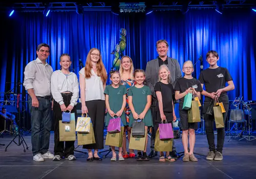 Von der Eröffnungsfanfare, über Früherziehungsgruppe, riesiges Gitarrenensemble aus drei Klassen, Ballettensemble, bis hin zum Percussionensemble, Kinderchor mit Blockflöten- und Schlagwerkunterstützung, Jugendblasorchester, Stadtmusik Korneuburg, Musikfreunde-Big Band, Flöten- Harfen-Ensemble, Band Rockin Rascals, Streicher-Flöten-Ensemble, Vororchester und dem Schulorchester war alles vertreten. Den schönen Rahmen auf der Werftbühne nützten Bürgermeister C.Gepp, Vizebürgermeisterin B.Haider-Wittmann und Musikschulleiter Peter Vasicek, um den heurigen Preisträgerinnen und Preisträgern des Wettbewerbs prima la musica zu gratulieren.