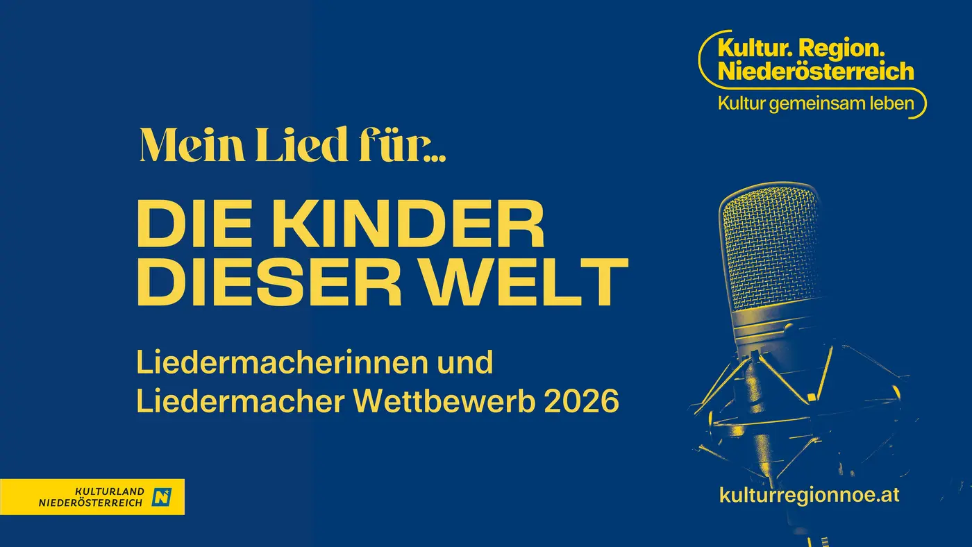Der neue Liedermacherinnen- und Liedermacher-Wettbewerb der Kultur.Region.Niederösterreich dreht sich ganz um die Kinder: Unter dem Titel „Mein Lied für … die Kinder dieser Welt“ sind alle Texterinnen und Texter, Komponistinnen und Komponisten, Singersongwriterinnen und -writer oder Gruppen, die ihre Gefühle und Gedanken für die Kleinsten der Gesellschaft zum Ausdruck bringen wollen. Die Zugänge sind bewusst offen gehalten – von lebensfroh und witzig bis hin zu tiefsinnig und nachdenklich und alle Facetten eines Kinderlebens berücksichtigend. Der Kreativität sind keine Grenzen gesetzt. So ist es auch möglich, Lieder mit Kindern zu komponieren oder Mitmachlieder zu schreiben.