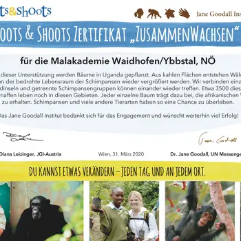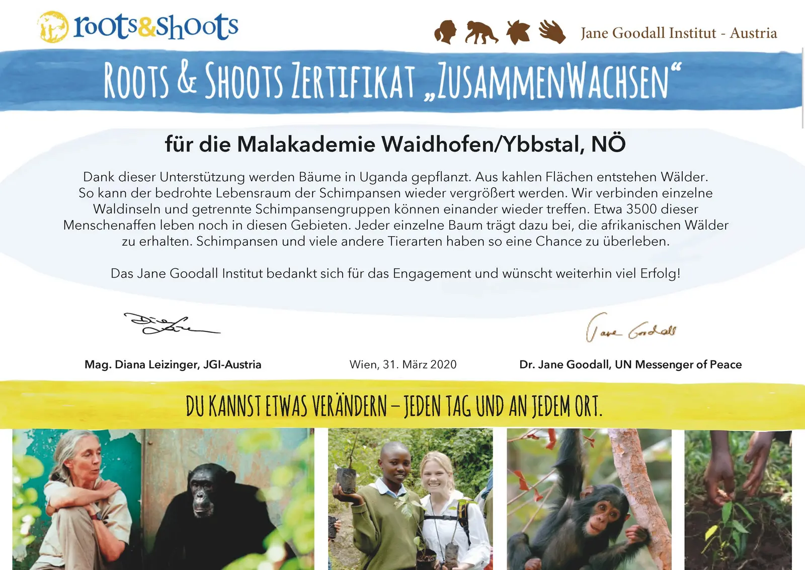 "Aus kahlen Flächen entstehen Wälder. So kann der bedrohte Lebensraum der Schimpansen wieder vergrößert werden. Etwa 3500 dieser Menschenaffen leben noch in diesen Gebieten. Jeder einzelne Baum trägt dazu bei, die afrikanischen Wälder zu erhalten. Schimpansen und viele andere Tierarten haben so eine Chance zu überleben. Das Jane Goodall Institut bedankt sich für das Engagement und wünscht weiterhin viel Erfolg", heißt es in dem Roots & Shoots Zertifikat "Zusammenwachsen", das die Malakademie KIDS als Dank fürs Mitmachen erhielt.