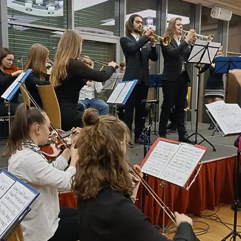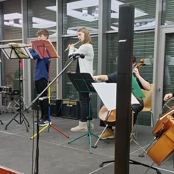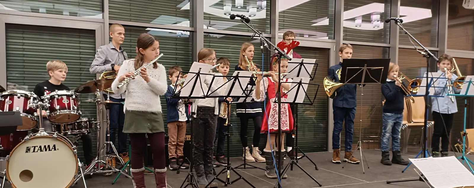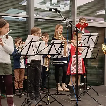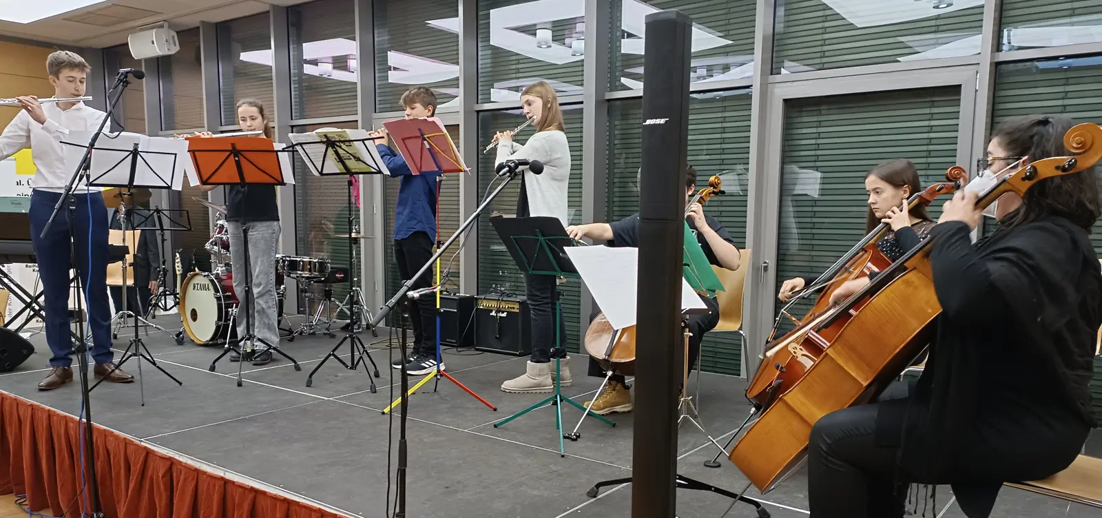 Nach einer kurzen Begrüßung durch den Musikschuldirektor Peter Vasicek hörte man einen Querschnitt durch die Musikschularbeit. Es präsentierten sich die verschiedensten Ensembles: Blechbläserensemble, Vororchester, Blockflötenensemble, Jugendblasorchester, Theatergruppe, Steptanzgruppe, Gitarrinis, Kinderchor-Harfen-Ensemble, Blockflötenensemble, Flöten-Cello-Ensemble, Kammermusikensemble, Saxophonensemble, Rockband und das Schulorchester, das die zwei Trompetensolisten Benjamin Szelestey und Sami Kahraman begleitete. Das Programm reichte von Telemann über Weihnachtslieder bis hin zu Gershwin und Elgar. Alles in allem – ein ansprechender musikalischer Abend mit vielen überraschenden Highlights!
