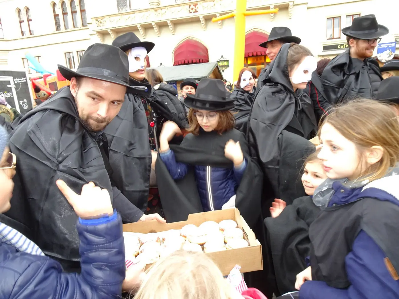 Viel Spaß hatten die SchülerInnen der Musikschule der Korneuburger Musikfreunde am Faschingsumzug in Korneuburg. Das Phantom der Oper hatte man als Motto gewählt. Diesem Motto wurde die Musikschule sowohl optisch als auch akustisch gerecht. Musikschuldirektor Peter Vasicek fuhr mit dem Auto voraus und die SchülerInnen mit ihren LehrerInnen folgten im Fußmarsch. Man hat gespielt, gesungen, getanzt, Süßigkeiten verteilt und eine Menge Spaß gemacht, auch für’s Publikum, wenn man die Papierschlangen aus den Tüten schoss. Die Kids, die sonst Schlagzeug spielen, durften diesmal den Kazoos Melodien entlocken. Zum Schluss gab’s Faschingskrapfen und obendrein den 3. Platz! Gratulation!