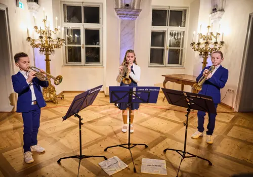 14. Dezember: Das Trompeten-Trio „Sona la musica“ mit Maximilian Engelmaier (10 Jahre), Stefan Winter (10 Jahre) und Lena Wimmer (10 Jahre) – vom Gemeindeverband der Musikschule Eggenburg Ignaz J. Pleyel – interpretiert „La Rejouissance“ von G. F. Händel.