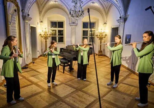 10. Dezember: Das Flöten-Quintett „AnMaNaNiAm“ mit Annika Braunsteiner (16 Jahre), Amely Fiedler (16 Jahre), Magdalena Wurst (16 Jahre), Nina Ernst (16 Jahre) und Natalie Pollak (17 Jahre) vom Gemeindeverband der Musikschule Retzer Land spielt „Lenas Song (Fly with Me)“ von Stefan Nilsson.
