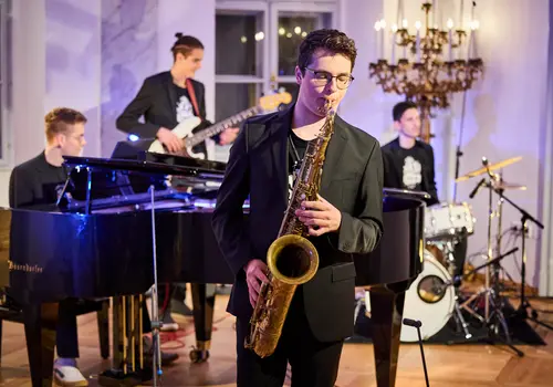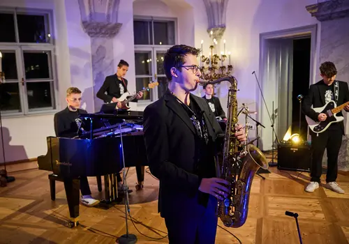 21. Dezember: Das Jazz-Ensemble „ONGA“ aus der Musikschule Wieselburg – mit Jonas Kopetzky (19 Jahre) auf dem Saxophon, Julian Palmanshofer (18 Jahre) am Schlagzeug, Jakob Scheruga (15 Jahre) auf der Gitarre, Lorenz Seifert (18 Jahre) auf dem Bass und Titus Leon Taubinger (18 Jahre) auf dem Keyboard – spielt „Süßer die Glocken nie klingen @ Jazz“ von Friedrich Wilhelm Kritzinger.