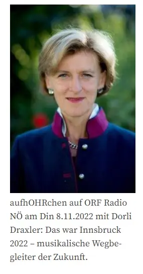 In der neuen Folge der Sendung "aufhOHRchen" am Di 8. November 2022 auf Radio Niederösterreich steht der Alpenländische Volksmusikwettbewerb im Zentrum: „Das war Innsbruck 2022 – musikalische Wegbegleiter der Zukunft“, präsentiert von Dorli Draxler.