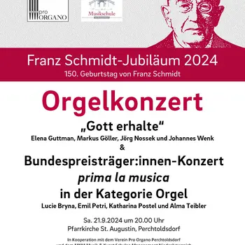 Am Sa 21. September 2024 um 20.00 Uhr findet das Orgelkonzert der Bundespreisträgerinnen und Bundespreisträger in der Pfarrkirche St. Augustin in Perchtoldsdorf statt!