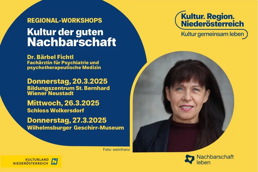 Der neue Regional-Workshop „Kultur der guten Nachbarschaft“ geht nach den ersten Stationen im Mostviertel und im Waldviertel weiter. Für das Industrieviertel, das Weinviertel und den Zentralraum rückt das Format am 20., 26., und 27. März den Wert des Zusammenhalts in den Mittelpunkt. Ziel ist es, Zusammenleben und eine wertschätzende Gemeinschaft zu kultivieren. Die Teilnahme an den Workshops mit Bärbel Fichtl ist kostenlos.