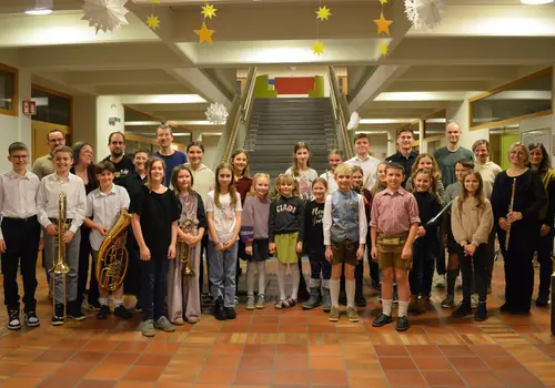 Foto 2: Gruppenfoto mit Mitwirkenden und Lehrkräften