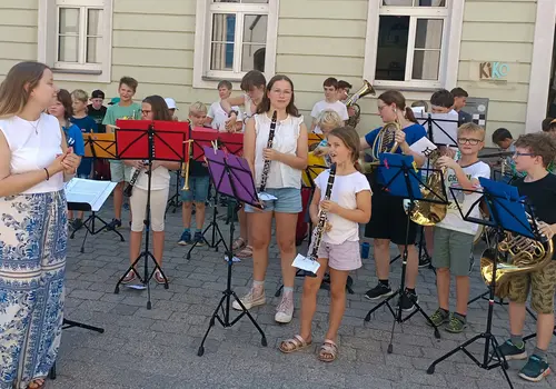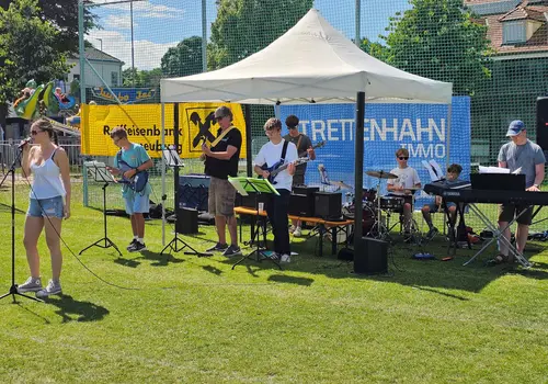 Aber nicht nur die Bläser waren aktiv. Auch die Musikschulband The Rockin‘ Rascals unter der Leitung von Erich Zinner ließen aufhorchen. Spielten sie doch am Guggenbergerhalle-Sportplatz im Rahmen des Kinderstadtfestes heiße Rhythmen. Es war ein Tag voller Spaß mit Musik, Tanz, Zauberei und Tombola.