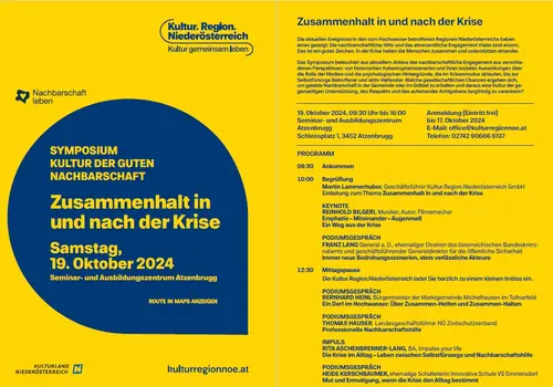 Das Symposium beleuchtet aus aktuellem Anlass das nachbarschaftliche Engagement aus verschiedenen Perspektiven: von historischen Katastrophenszenarien und ihren sozialen Auswirkungen, über die Rolle der Medien und den psychologische Hintergründen, die im Krisenmodus ablaufen, bis zur Selbstfürsorge Betroffener und aktiv Helfenden. Welche gesellschaftlichen Chancen ergeben sich, um gelebte Nachbarschaft in der Gemeinde oder im Grätzel zu erhalten und daraus eine Kultur der gegenseitigen Unterstützung, des Respekts, der Ermutigung und des aufeinander Achtgebens langfristig zu verankern?