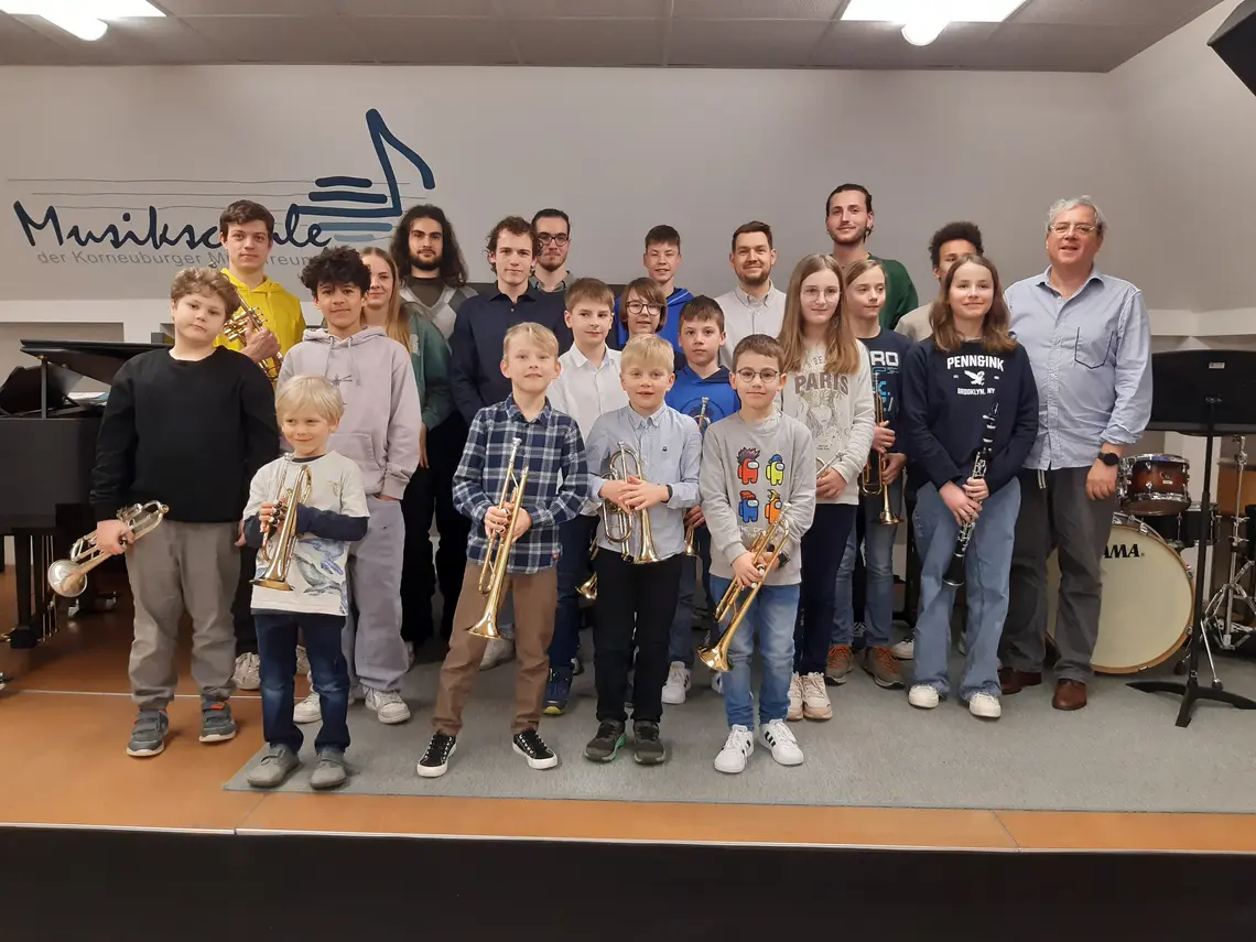 Walter Fend – Lehrer für Trompete und Klavier – lud zum Vorspielabend in der Musikschule der Korneuburger Musikfreunde. Mit Kinderliedern begann das Programm und steigerte sich dann bis zu wirklich schwierigen Werken wie Jazzsonata von Botschinsky und Fables of Faubus von Mingus. Außerdem hörte man die Mini-Jazz-Band mit Oh Happy Day und die Jazz-Band mit South of Ela im Steinwaysaal am Kirchenplatz. „Vorspielabende lösen oft einen Motivationsschub aus“, erzählt Musikschuldirektor Peter Vasicek. Wenn jüngere Schülerinnen und Schüler von Fortgeschrittenen hören, was man dem Instrument alles entlocken kann, kann das der Beginn einer intensiveren Übungsphase sein – will man doch selbst auch etwas weiterbringen!