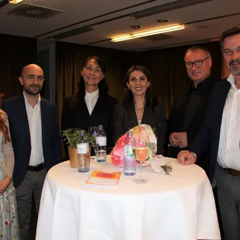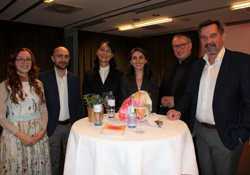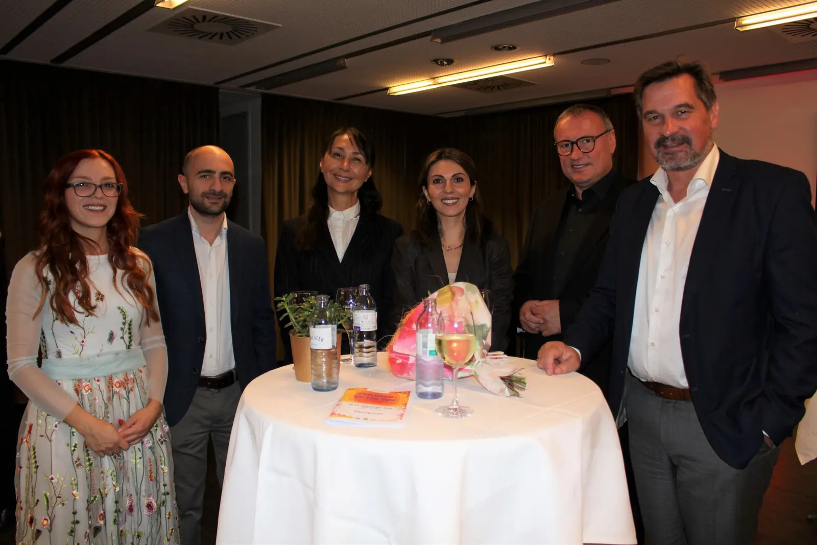 Premiere_2 – Die Künstlerin Tata Asatiani-Aigner alias Filia Solis, die Vertretung der georgischen Botschaft in Wien, Luka Abschilava, Nina Bausbek und Mariam Schubäus, Bürgermester Werner Krammer (von links) unterhielten sich gut beim Empfang vor der Uraufführung des Kunstprojekts „Children Of The Sun“. (Fotocredit: Andreas Kössl)