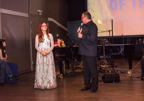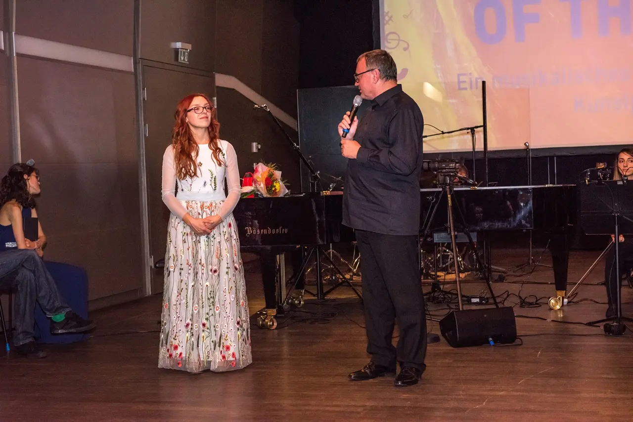 Premiere_5 Die Künstlerin und Autorin des musikalischen und multimedialen Kunstprojekts „Children Of The Sun“ Tata Asatiani-Aigner alias Filia Solis begrüßte gemeinsam mit dem Direktor des Musikschulverbands Waidhofen/Ybbstal und dem Veranstalter des Kunstprojekts Christian Blahous sowie die Zuschauer:nnen. (Fotocredit: Franz Nimetz)