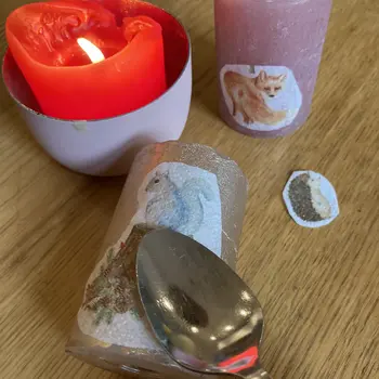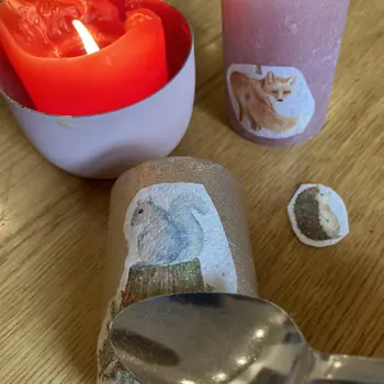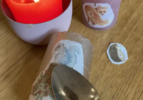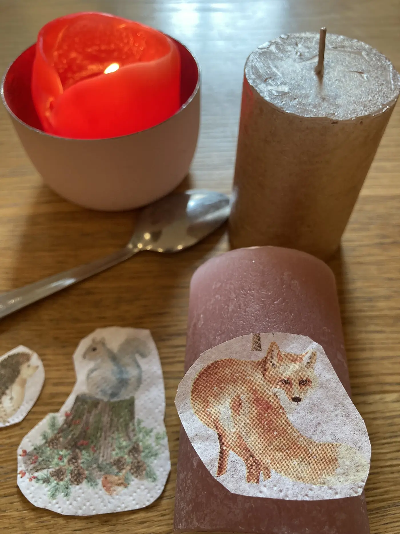 Zuerst die Motive für die Kerze aus den Servietten ausschneiden. Danach die unteren Schichten der Serviette ablösen, sodass nur die oberste Schicht mit dem Motiv übrigbleibt. Als Nächstes wird das Teelicht angezündet und der Löffel über der kleinen Flamme erhitzt. Wenn die Motive ihren Platz auf der Kerze gefunden haben, mit dem erwärmten Löffel über das Motiv gleiten. Das Wachs der Kerze schmilzt dabei ganz leicht an und klebt die ausgeschnittene Serviette ohne Kleber fest. Die verzierten Kerzen auskühlen lassen und fertig sind die Weihnachtskerzen!