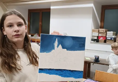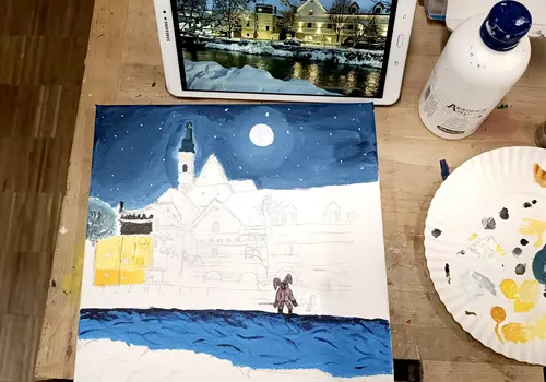 Die Malakademie KIDS Scheibbs gestaltet eine Weihnachtskarte für die Schmelzer Musikschule. Zu sehen sind die Erlaufpromenade im Schnee mit Blick Richtung Hauptplatz und Kirchturm in wunderschöner abendlicher Beleuchtung. Ebenso malten die Kinder mit Begeisterung weihnachtliche Bilder. Hier eine kleine Kostprobe: