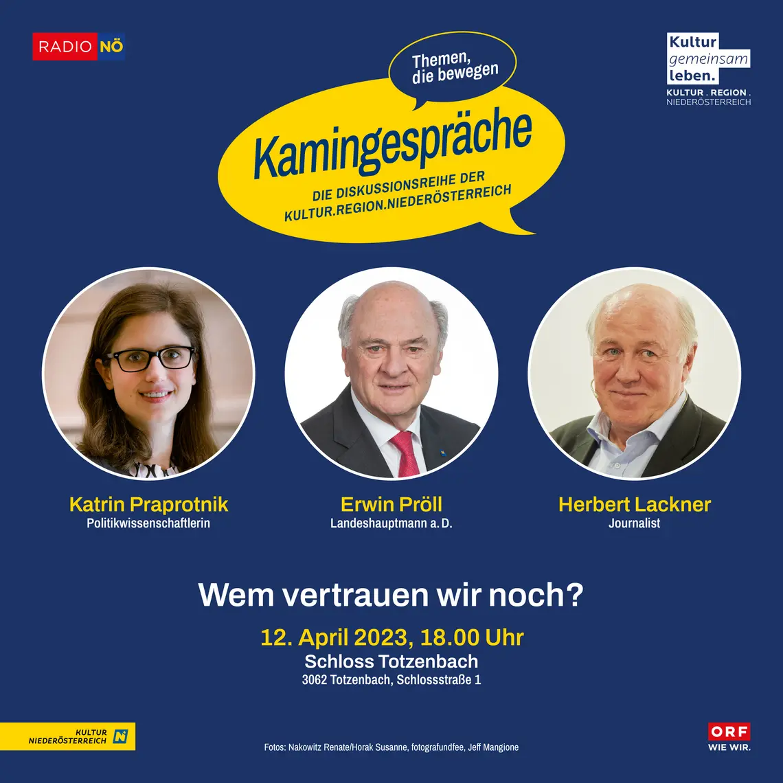 Zu diesem Thema diskutieren am Di 12. April 2023 ab 18.00 Uhr im Rahmen der Kamingespräche der Kultur.Region.Niederösterreich Landeshauptmann a.D. Erwin Pröll, Politikwissenschaftlerin Katrin Praprotnik und Journalist Herbert Lackner in Schloss Totzenbach.