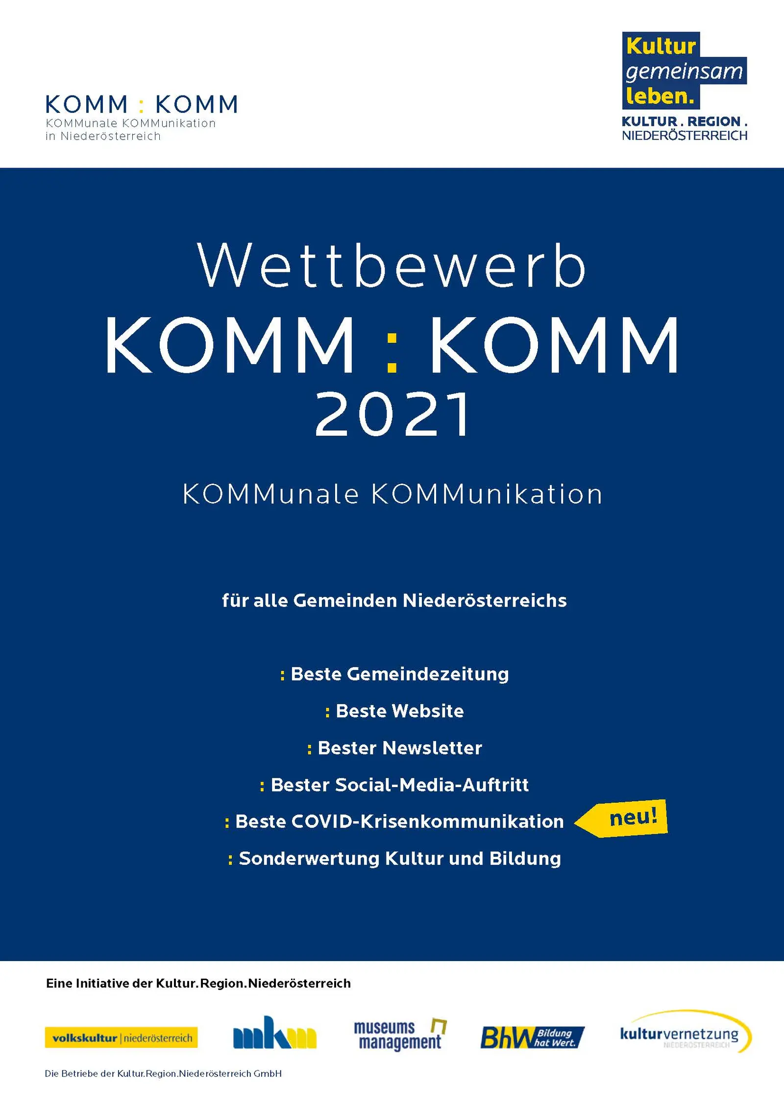 Der Weg der Vermittlung von Inhalten, Gedanken, Ideen sowie die Werte für ein gemeinsames kommunales Leben werden in diesem Wettbewerb aufgezeigt und anschließend prämiert. „KOMM:KOMM“ soll Gewinn und Denkanstoß zugleich sein, um die Kommunikation in den Gemeinden zu stärken und weiterzuentwickeln.