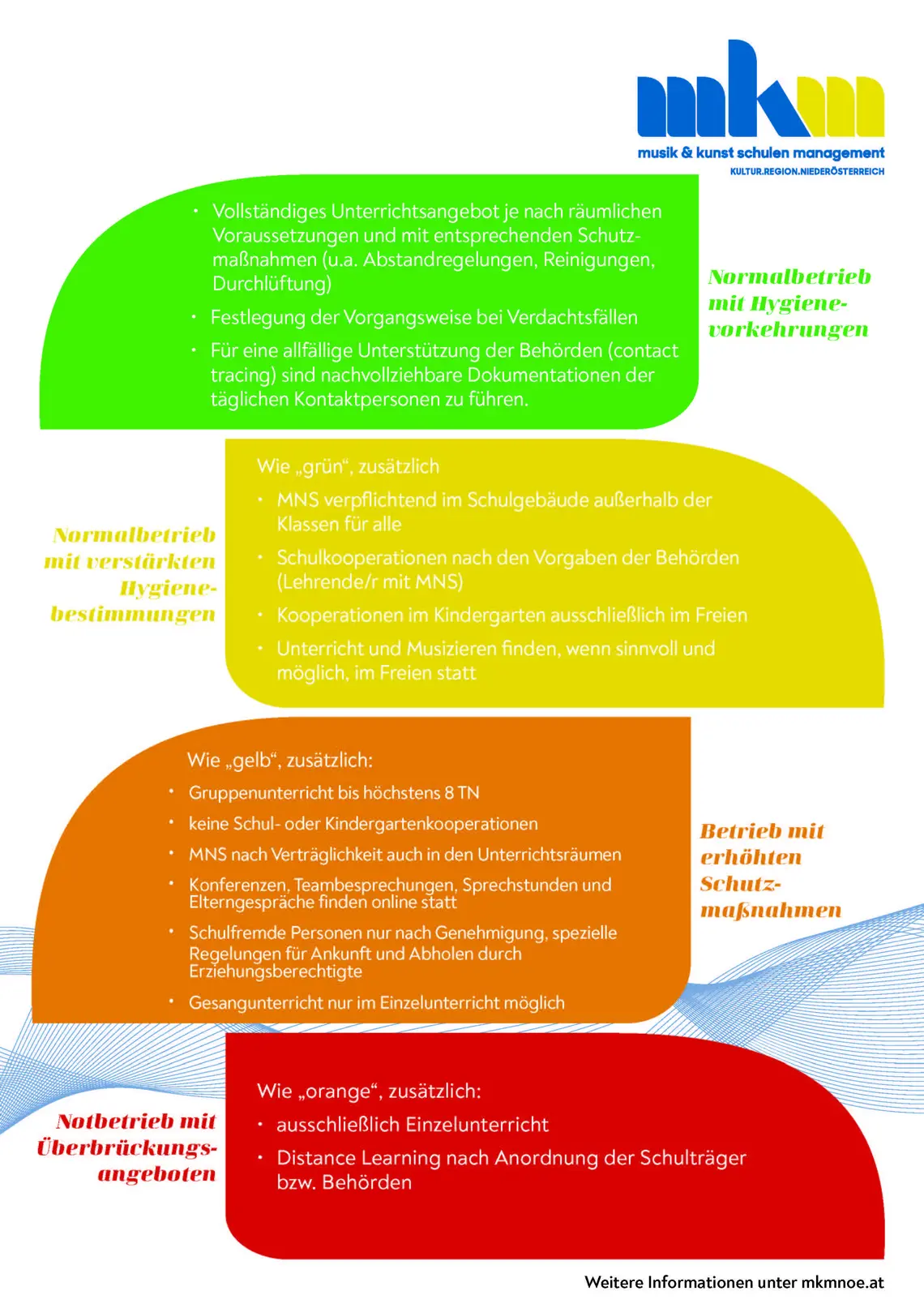 Die konkrete Umsetzung vor Ort obliegt dem jeweiligen Musikschulerhalter (im Normalfall die Gemeinde) der die zentralen Empfehlungen je nach Gegebenheiten und Erfordernissen anpasst, ergänzt und umsetzt. Dieser kann jedoch am Unterrichtsstandort auch weitere oder adaptierte Maßnahmen setzen. Insofern gelten die Ampelregelungen und Maßnahmen, die der Schulerhalter vor Ort festlegt. Die konkrete Umsetzung der Kreativakademien vor Ort muss in Absprache mit dem MKM sowie den Gemeinden zwecks Nutzung der Räumlichkeiten geklärt werden.