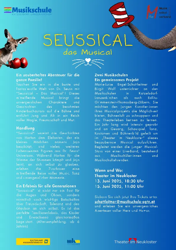 Zwei Musikschulen - ein gemeinsames Projekt! Marie-Luise Engel-Schottleitner und Birgit Wolf unterrichten sowohl an den Musikschulen in Katzelsdorf-Lanzenkirchen als auch in Edlitz-Grimmenstein-Thomasberg-Zöbern. Sie möchten den jungen Künstlerinnen und Künstlern ihres Musicalprojektes die Möglichkeit bieten, Bühnenluft zu schnuppern und das Theaterleben kennzulernen. Ein Jahr lang wird intensiv geprobt und an Gesang, Schauspiel, Tanz, Kostümen und Bühnenbild gefeilt, um im “Theater im Neukloster” dieses bezaubernde Musical aufzuführen. Begleitet werden die jungen Musical-Stars von einer Live-Band, bestehend aus Musikschülerinnen und Musikschülern und Musikschullehrenden.